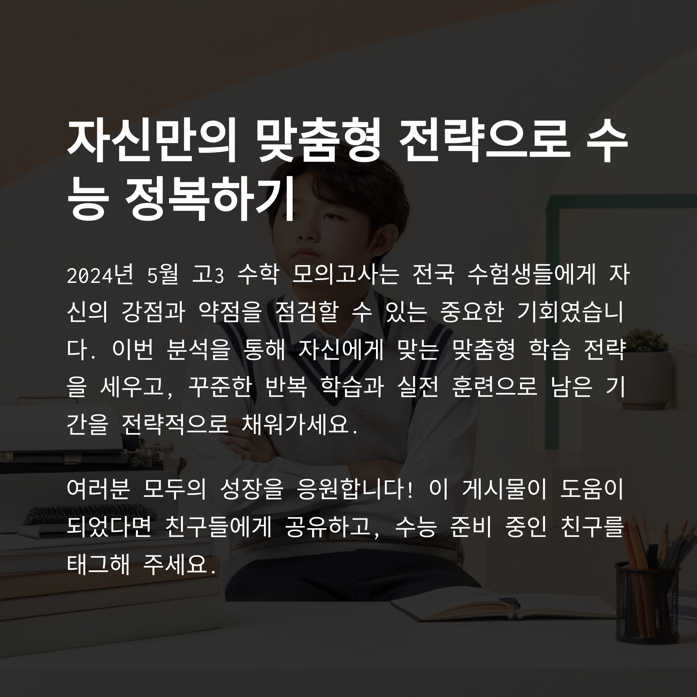 2024년 5월 고3 수학 모의고사는 전국 수험생들에게 자신의 강점과 약점을 점검할 수 있는 중요한 기회였습니다. 메인 키워드인 ‘2024년 5월 고3 수학 모의고사’, ‘수학 모의고사 난이도’, ‘수능 대비 전략’은 앞으로도 반복적으로 주목받을 수밖에 없습니다. 이번 분석을 통해 자신에게 맞는 맞춤형 학습 전략을 세우고, 꾸준한 반복 학습과 실전 훈련으로 남은 기간을 전략적으로 채워가길 바랍니다. 여러분 모두의 성장을 응원합니다!