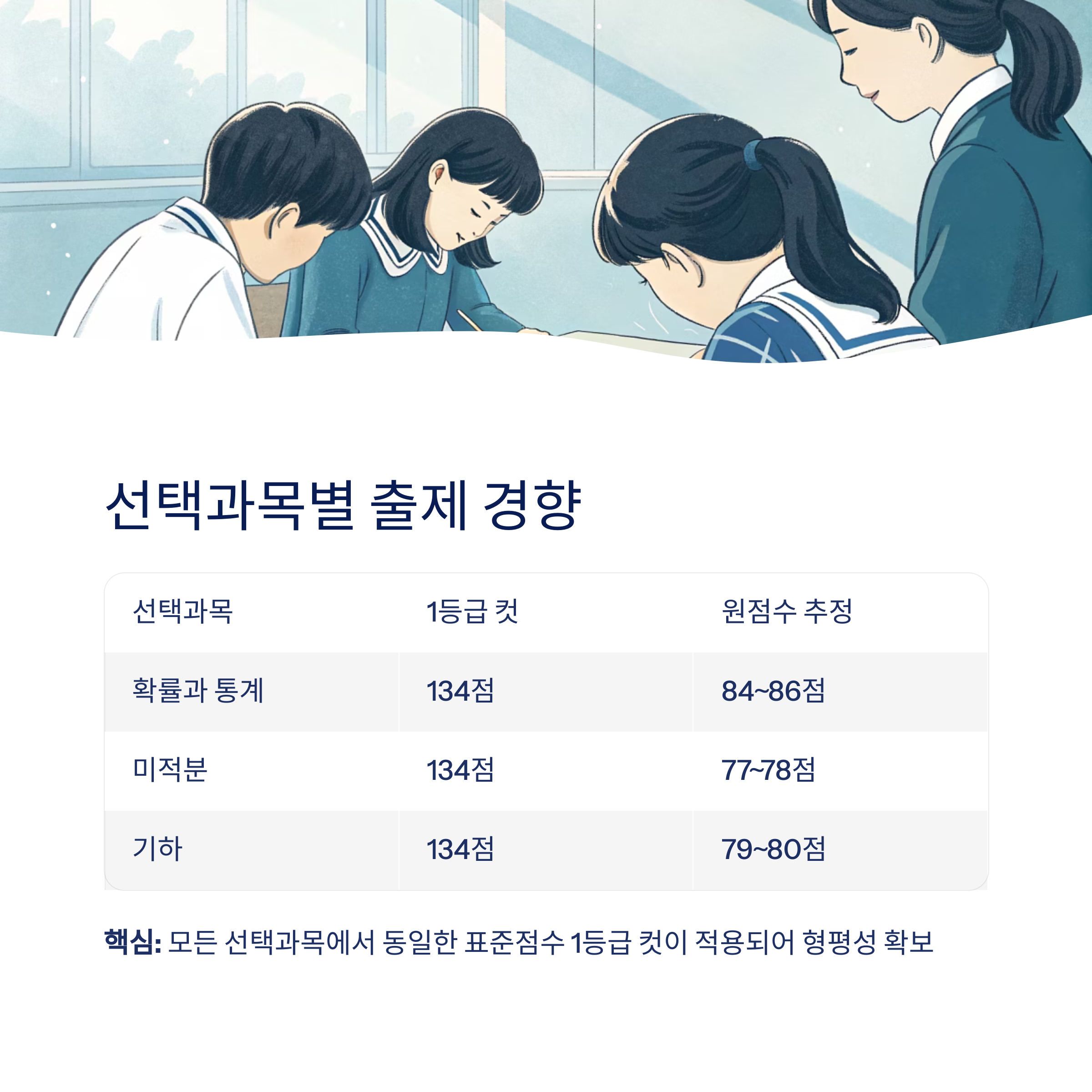 핵심: "모든 선택과목에서 동일한 표준점수 1등급 컷이 적용되면서 형평성이 확보되었고, 특히 미적분은 낯선 문항 포장으로 상위권 변별력이 확보되었다."