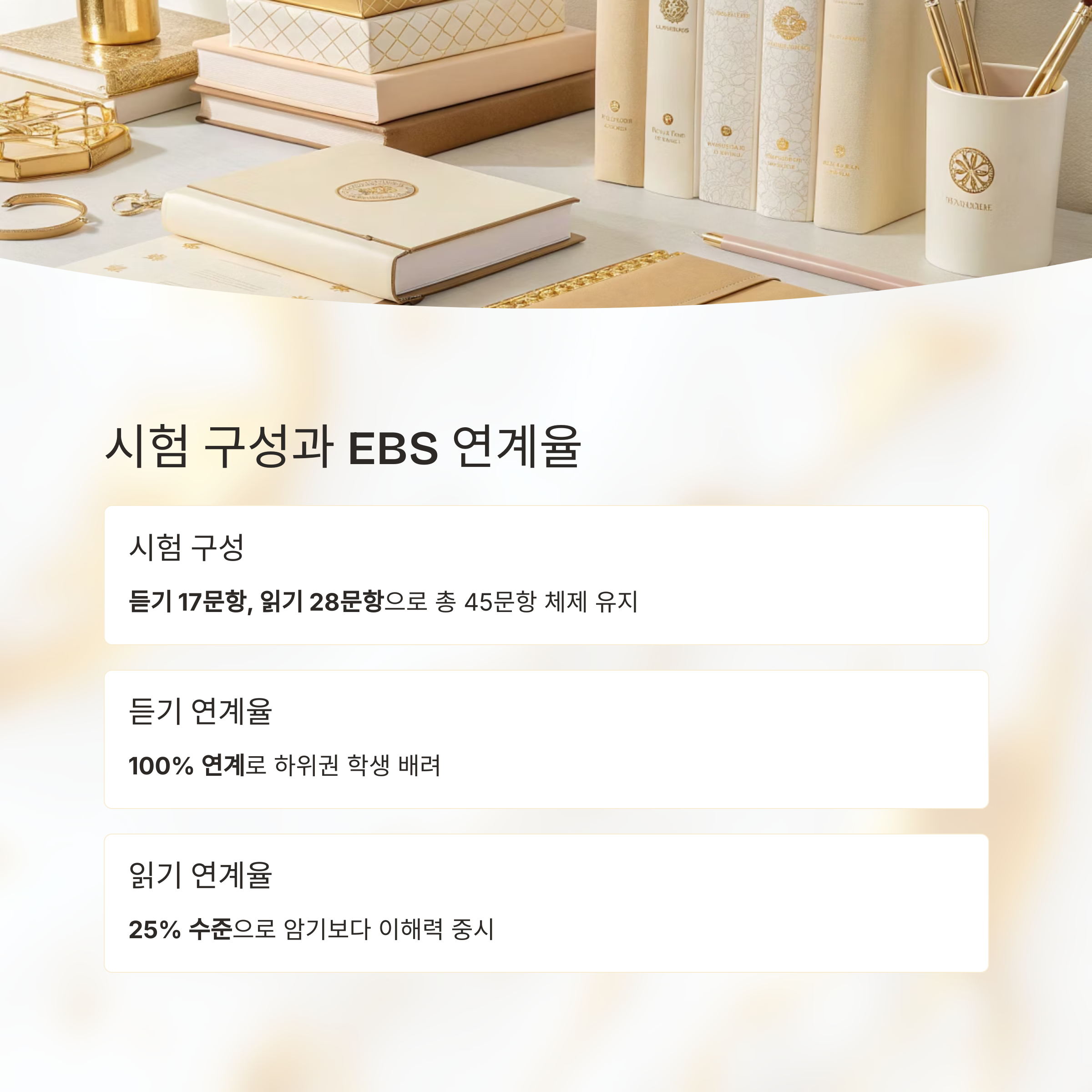 2024년 6월 영어 모의고사는 듣기 17문항, 읽기 28문항으로 구성된 총 45문항 체제를 유지했습니다. EBS 연계율은 전체 53.3%로, 듣기 전 문항 연계(100%)와 달리 읽기 문항에서는 상대적으로 낮은 25% 수준의 연계가 이루어졌습니다.