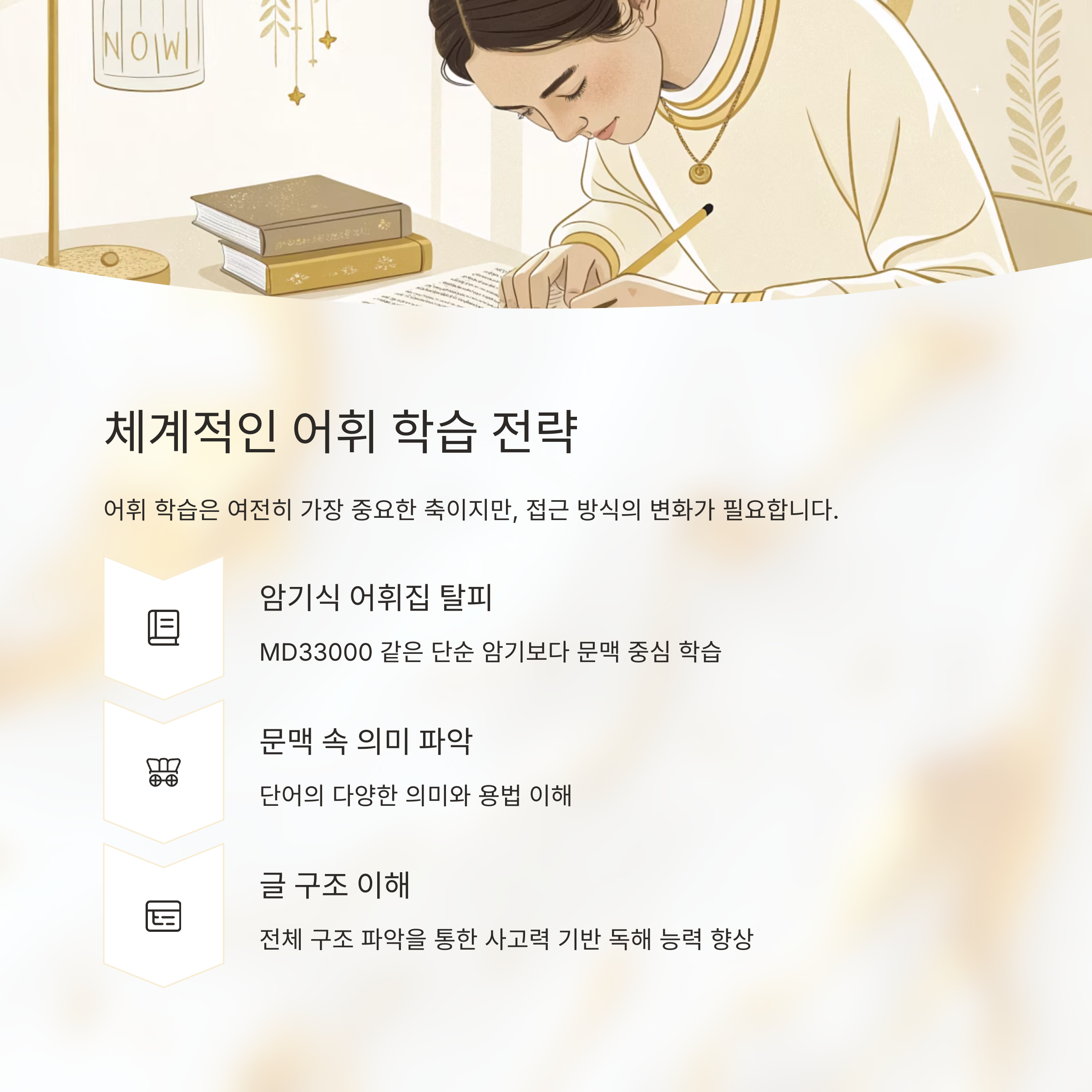 어휘 학습은 여전히 가장 중요한 축입니다. 하지만 MD33000 같은 암기식 어휘집보다는, 문맥 속 의미 파악 중심의 어휘 학습이 필요합니다.