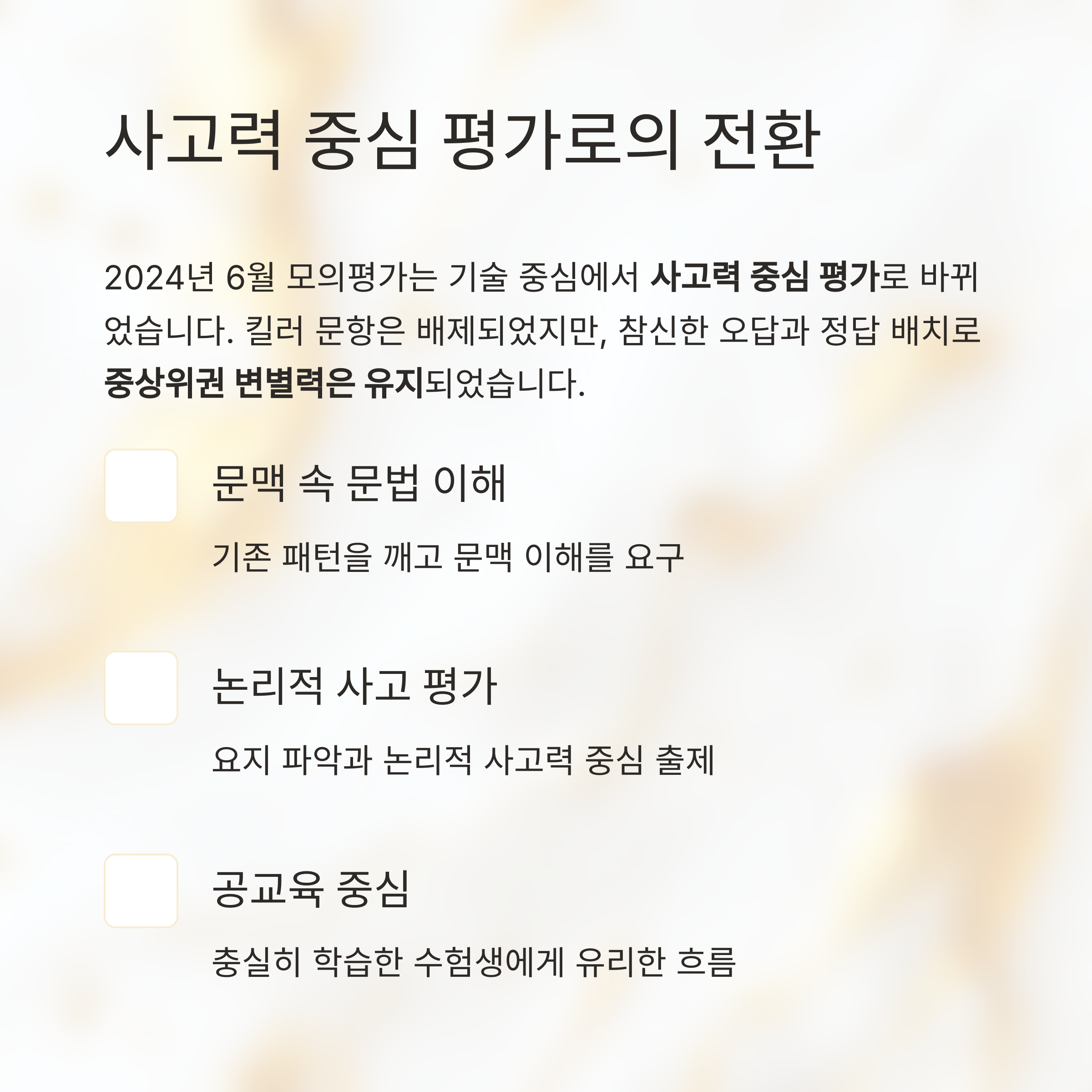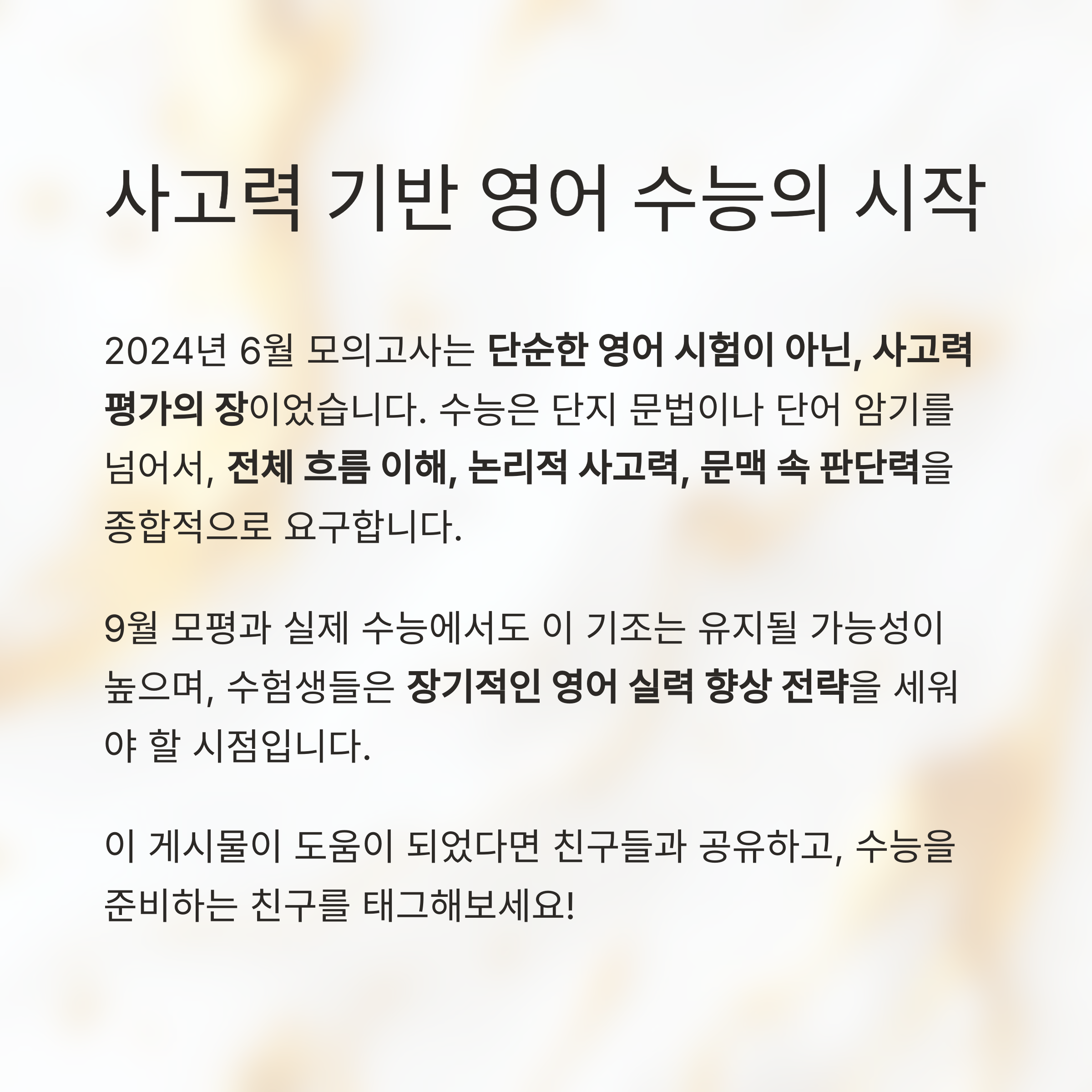 2024년 6월 모의평가는 기존의 기술 중심 문제풀이에서 탈피하여, 영어 지문을 정확히 이해하고 해석할 수 있는 사고력 중심의 평가로 바뀌었습니다. 킬러 문항은 배제되었지만, 참신한 오답과 정답 배치를 통해 중상위권 변별력은 유지되었으며, 공교육 범위 내에서 충실히 학습한 수험생에게 유리한 흐름을 보였습니다.