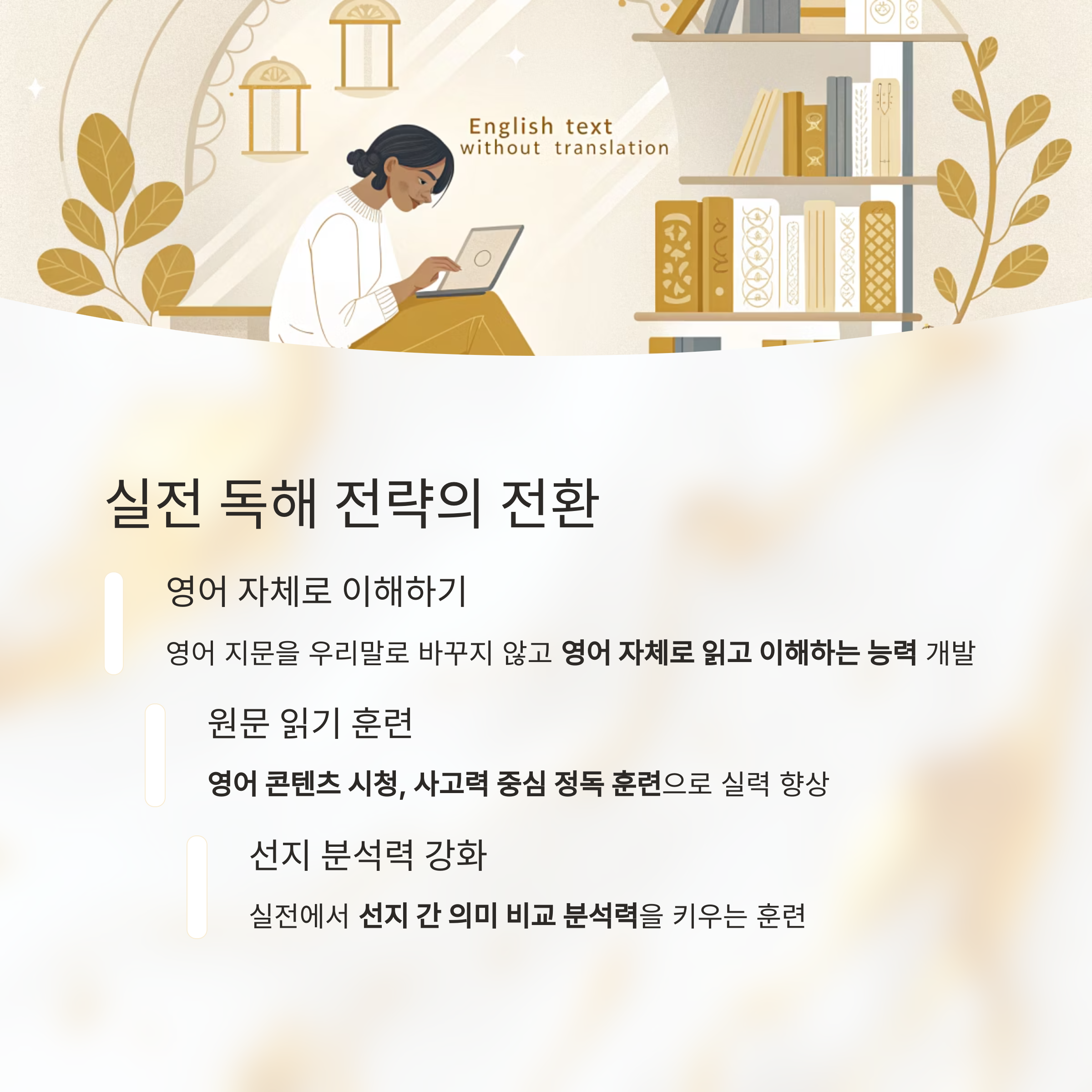 영어 지문을 우리말로 바꾸지 않고 영어 자체로 읽고 이해하는 능력이 필수입니다. 원문 읽기, 영어 콘텐츠 시청 등을 통해 사고력 중심 정독 훈련이 중요합니다.