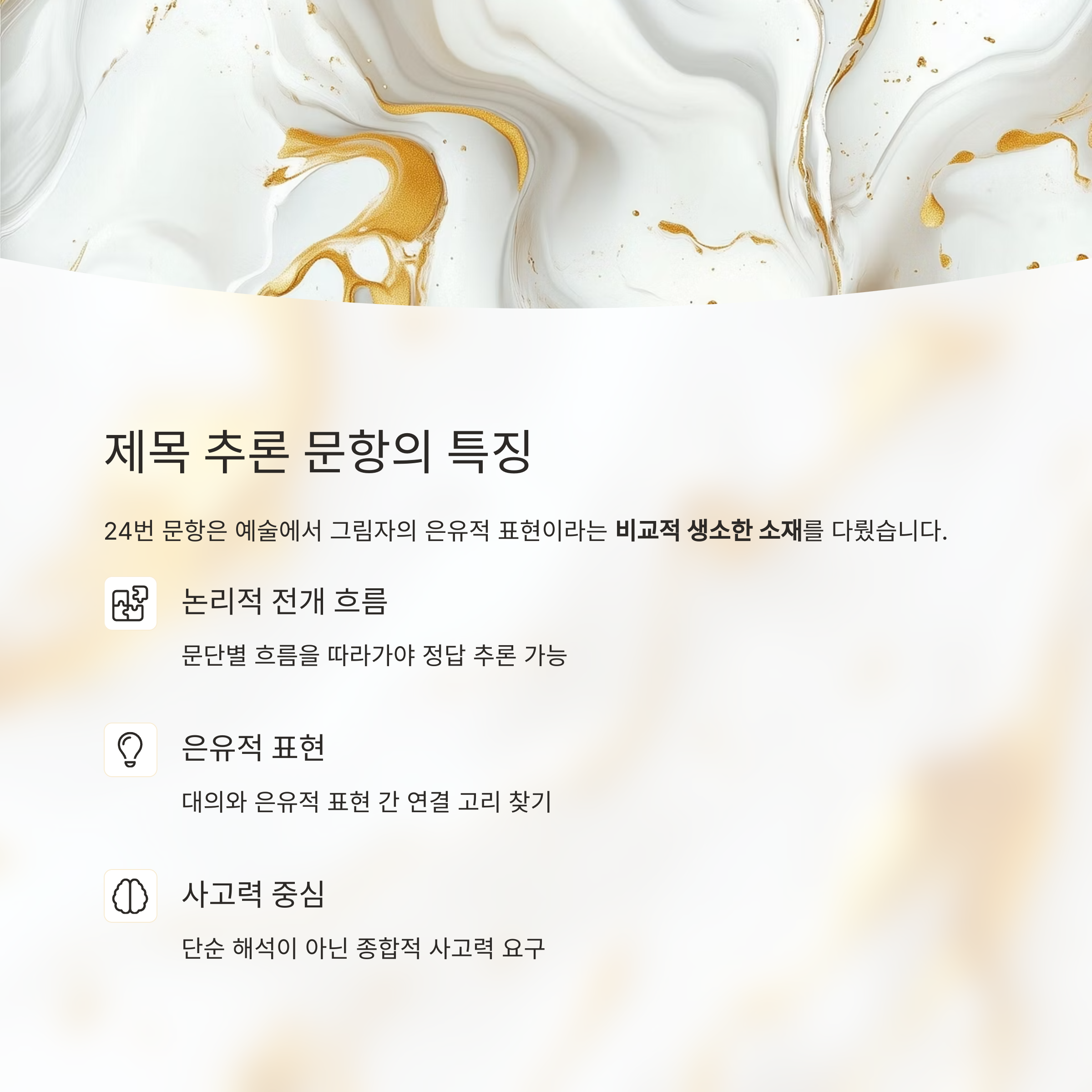 예술에서 그림자의 은유적 표현이라는 비교적 생소한 소재를 다뤘으며, 문단별 논리적 전개 흐름을 따라가야만 정답 추론이 가능한 구조였습니다.