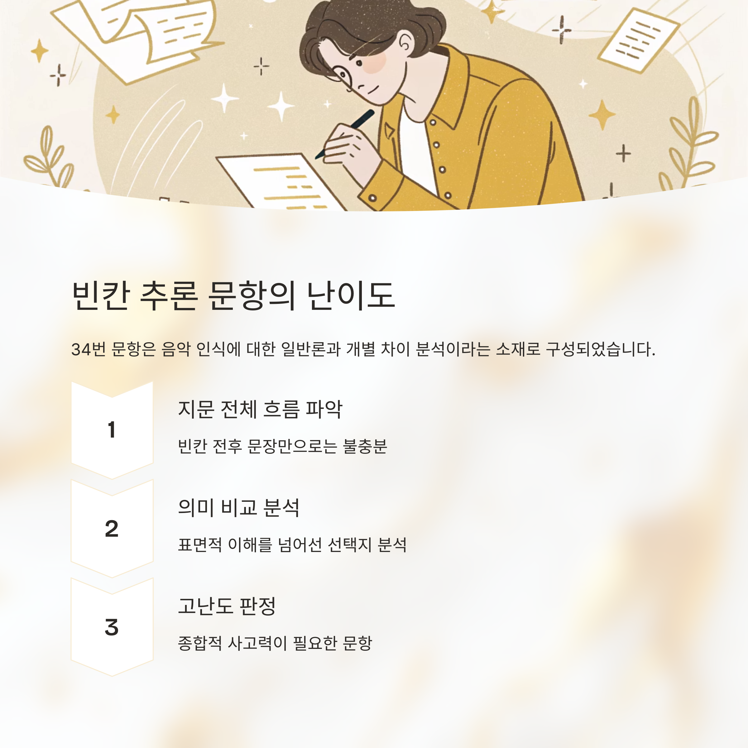 음악 인식에 대한 일반론과 개별 차이 분석이라는 소재로 구성되었으며, 빈칸 전후 문장뿐 아니라 지문 전체 흐름을 파악해야만 정답 도출이 가능했습니다.
