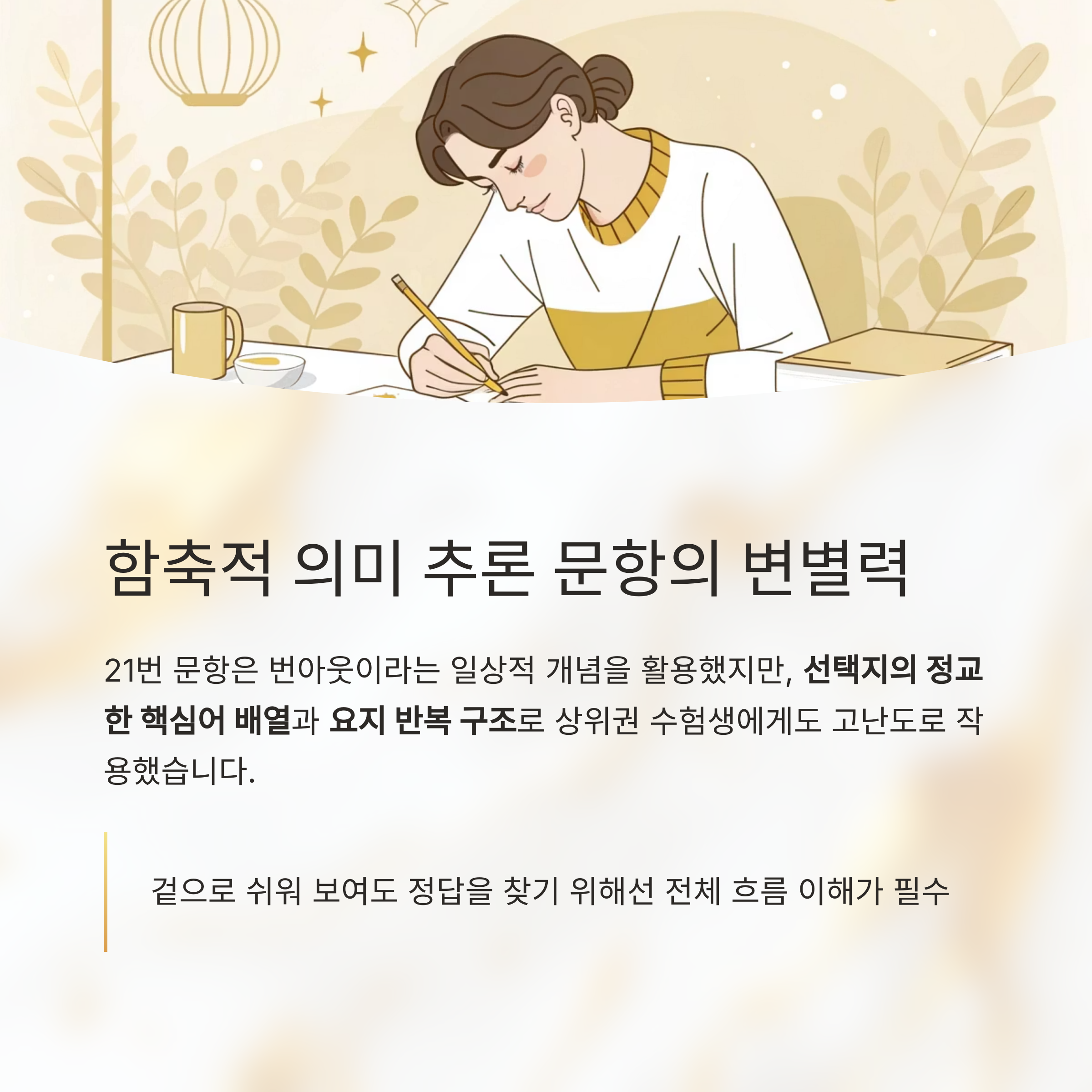 번아웃(burn-out)이라는 일상적 개념을 활용했지만, 선택지의 정교한 핵심어 배열요지 반복 구조로 인해 상위권 수험생에게도 고난도로 작용했습니다.