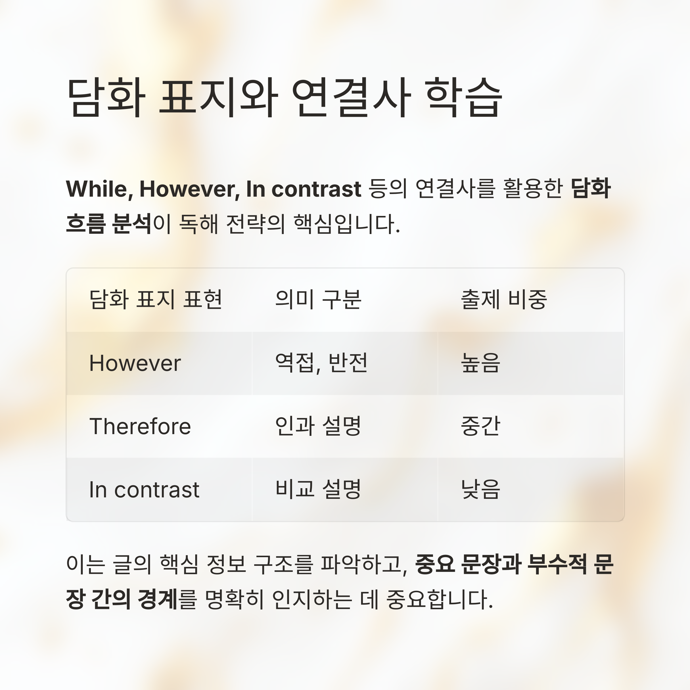 While, However, In contrast 등의 연결사를 활용한 담화 흐름 분석이 독해 전략의 핵심입니다.