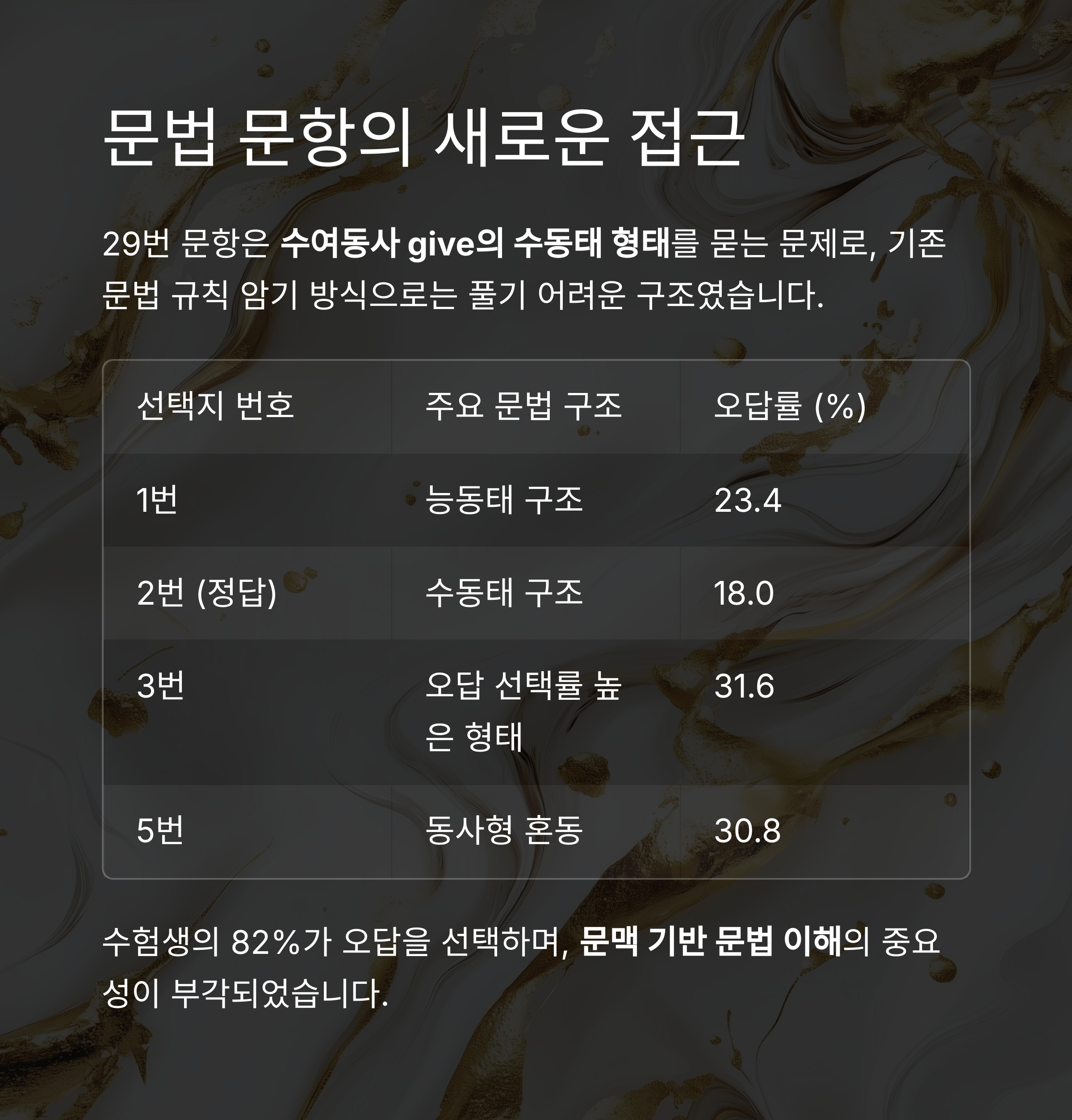 29번 문항은 수여동사 give의 수동태 형태를 묻는 문제로, 기존 문법 규칙 암기 방식으로는 풀기 어려운 구조였습니다.