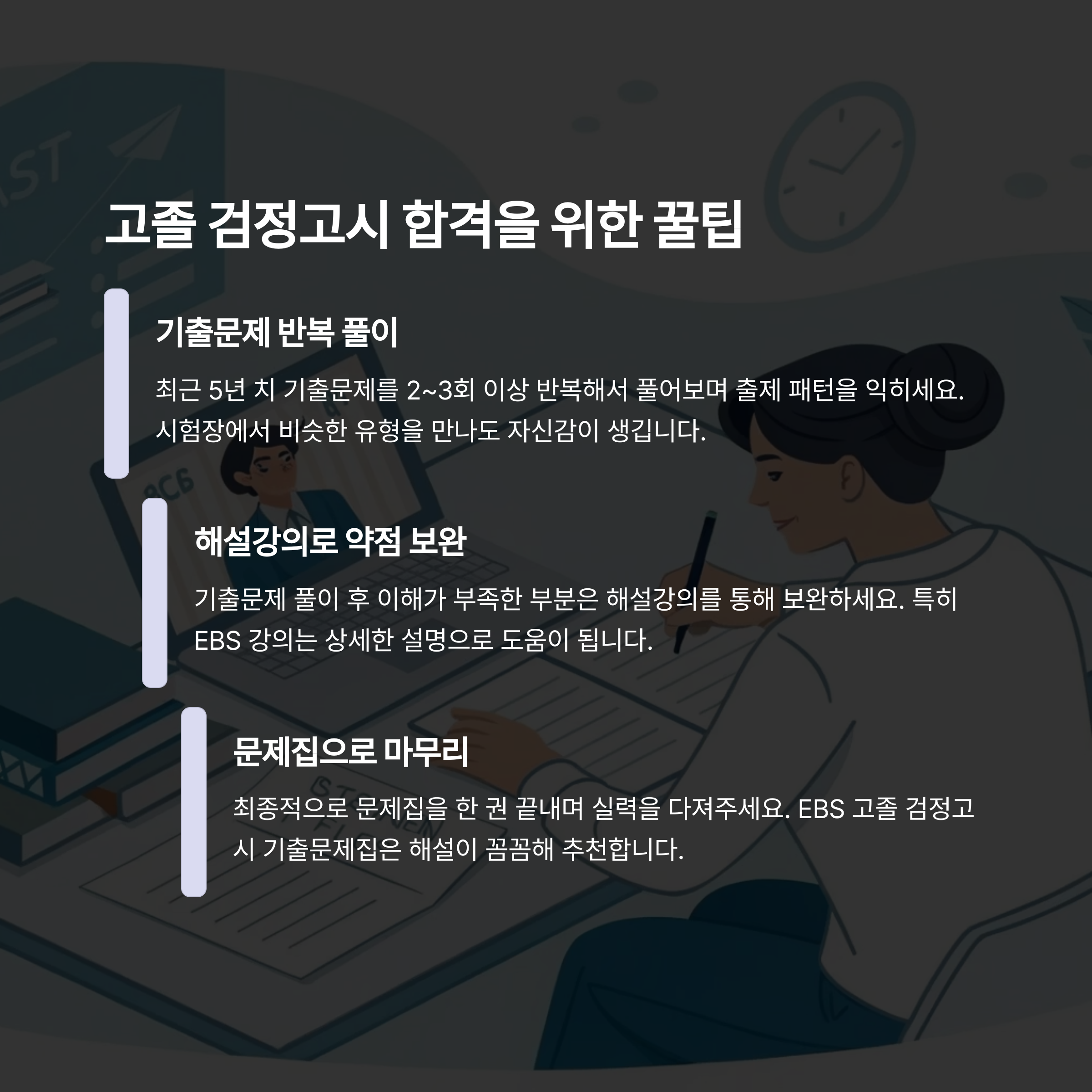 기출문제 풀이가 끝난 후에는 해설강의로 약점을 다시 보완하고, 최종적으로 문제집을 한 권 끝내며 실력을 다져주세요. 특히 EBS 고졸 검정고시 기출문제집은 해설이 꼼꼼해 추천할 만합니다.