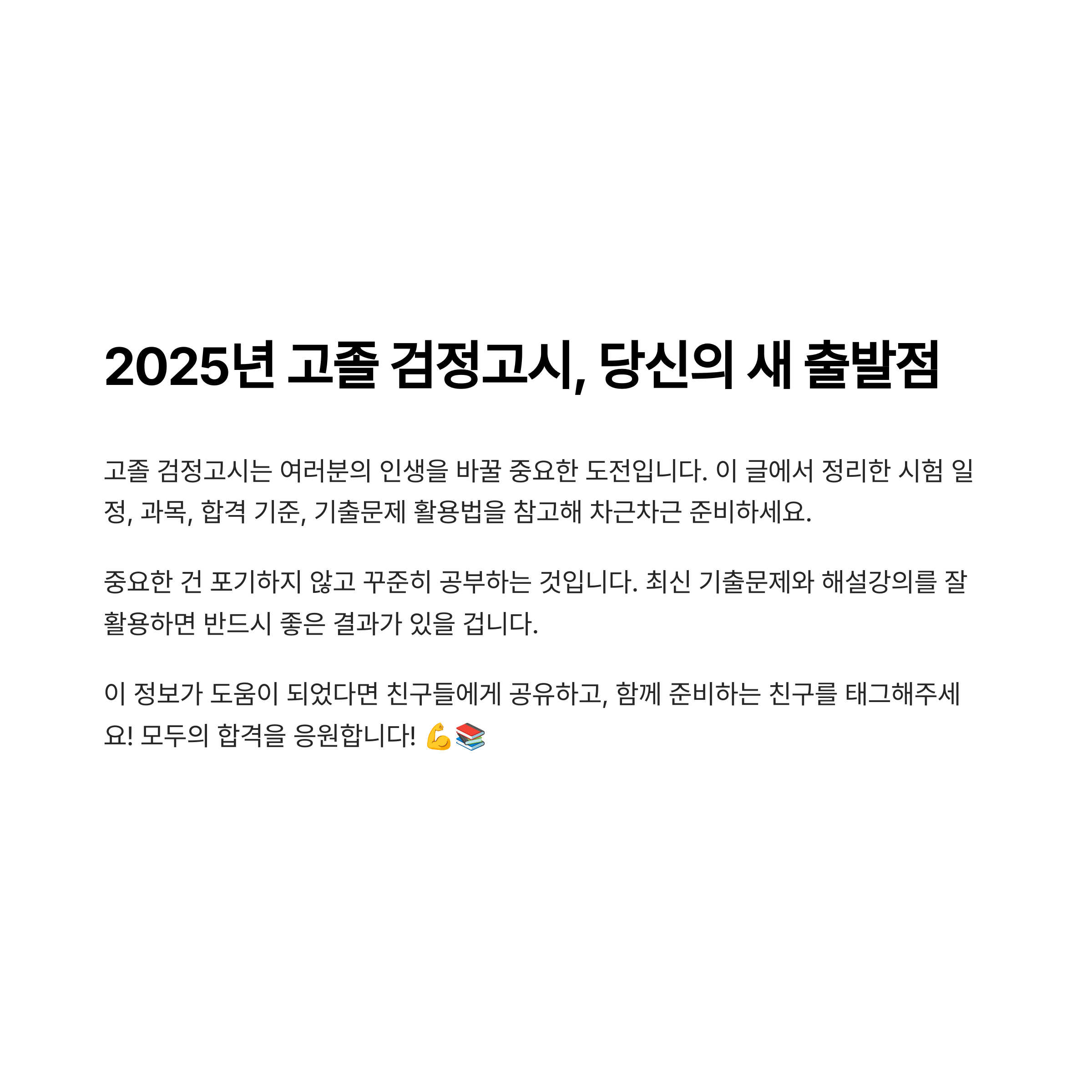 2025년 고졸 검정고시는 여러분의 인생을 바꿀 중요한 도전입니다. 이번 글에서 정리한 시험 일정, 과목, 합격 기준, 기출문제 활용법을 잘 참고해 차근차근 준비하세요. 중요한 건 포기하지 않고 꾸준히 공부하는 것입니다. 최신 기출문제와 해설강의를 잘 활용하면 반드시 좋은 결과가 있을 겁니다.