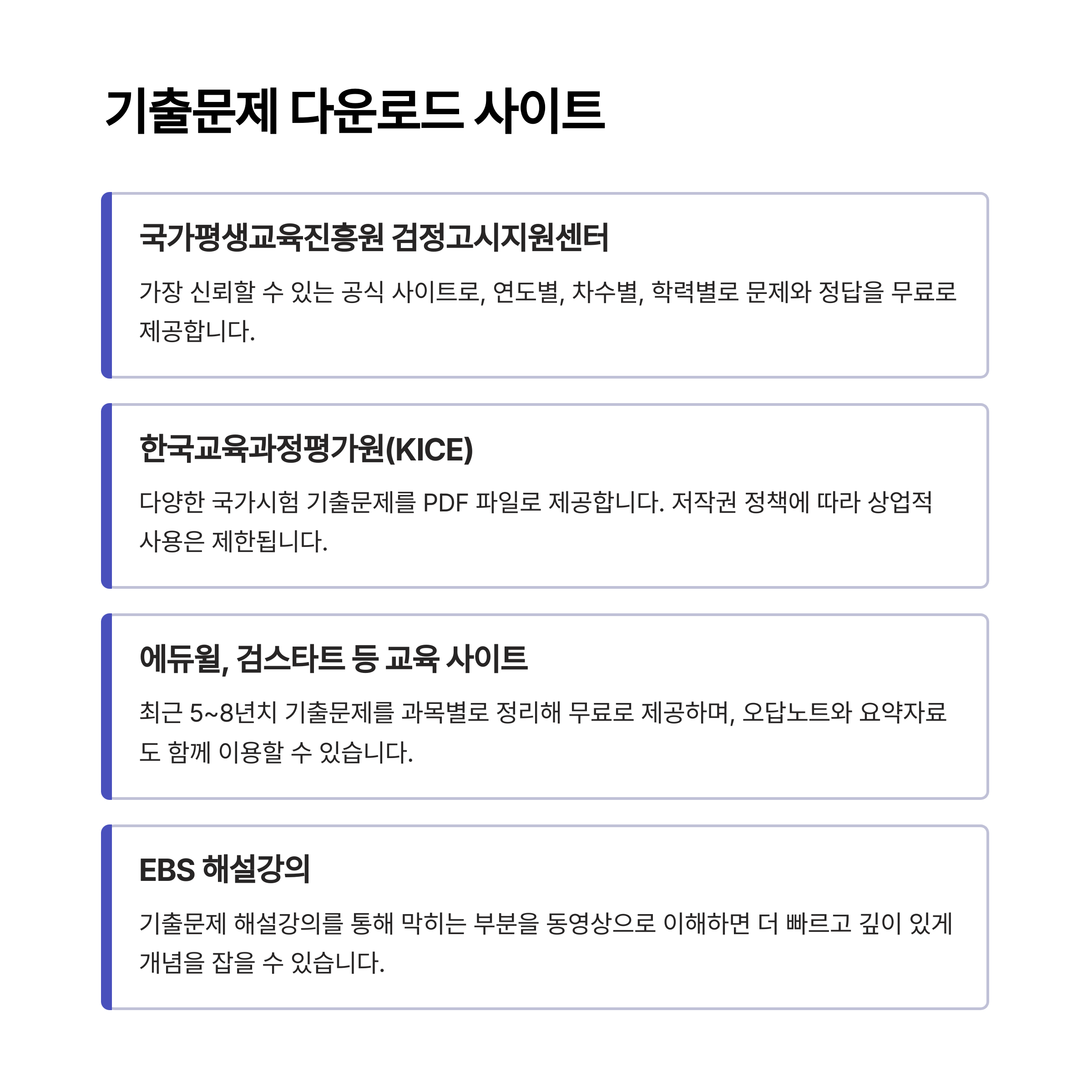 한국교육과정평가원 홈페이지에서도 고졸 검정고시를 포함해 다양한 국가시험 기출문제를 PDF 파일로 제공합니다. 다만 저작권 정책에 따라 상업적 사용은 제한되니 참고용으로만 활용하세요.