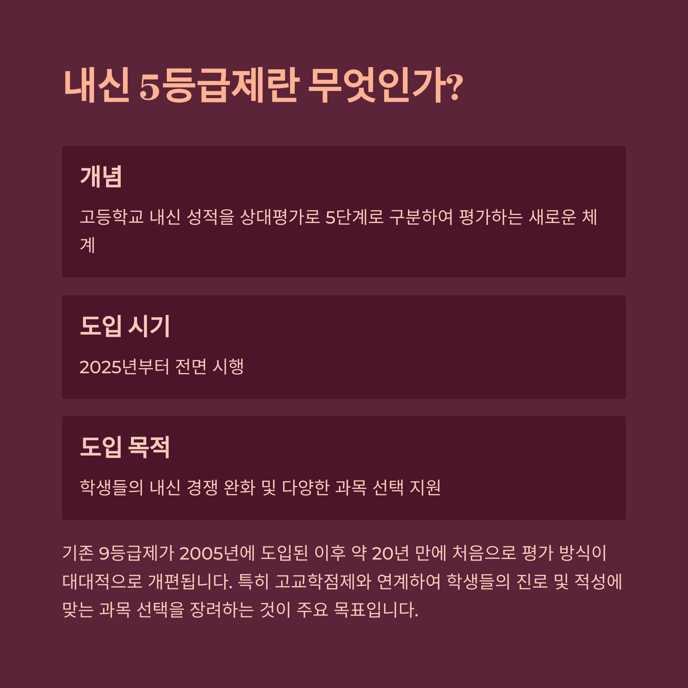 2025년부터 도입될 내신 5등급제는 단순한 등급 축소를 넘어, 한국 고등학교 교육의 패러다임을 바꾸는 변화입니다.