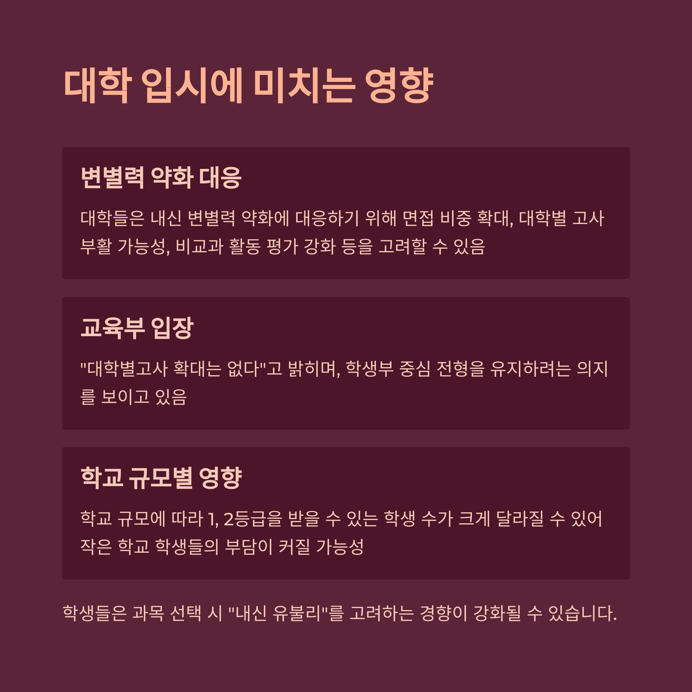 규모가 작은 학교에서는 1등급 비율이 줄어들어 학생들의 부담이 커질 가능성도 존재합니다. 또한, 학생들은 과목 선택 시 "내신 유불리"를 고려하는 경향이 강화될 수 있습니다.
