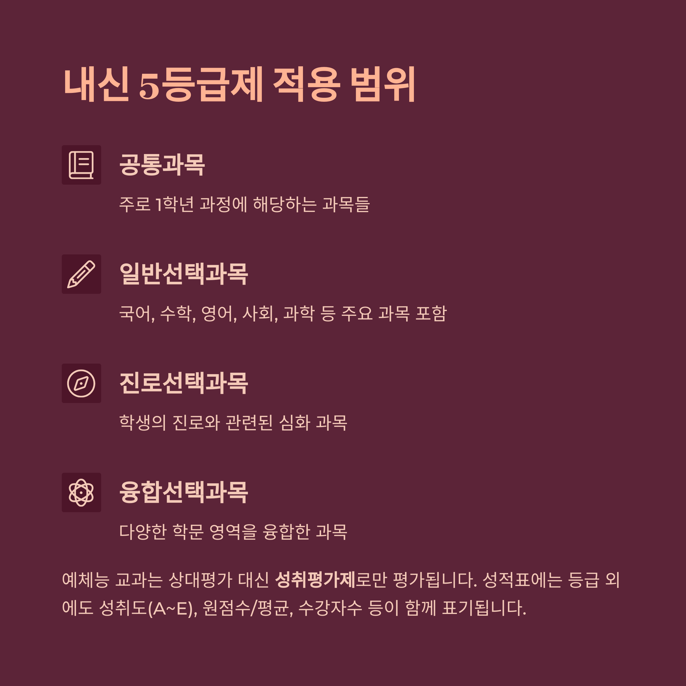 국어, 수학, 영어, 사회, 과학 등의 주요 과목이 모두 포함됩니다. 다만, 사회·과학 융합선택 9개 과목은 절대평가만 적용하고, 기술·가정, 정보, 제2외국어, 한문 등에도 5등급 상대평가가 적용됩니다.