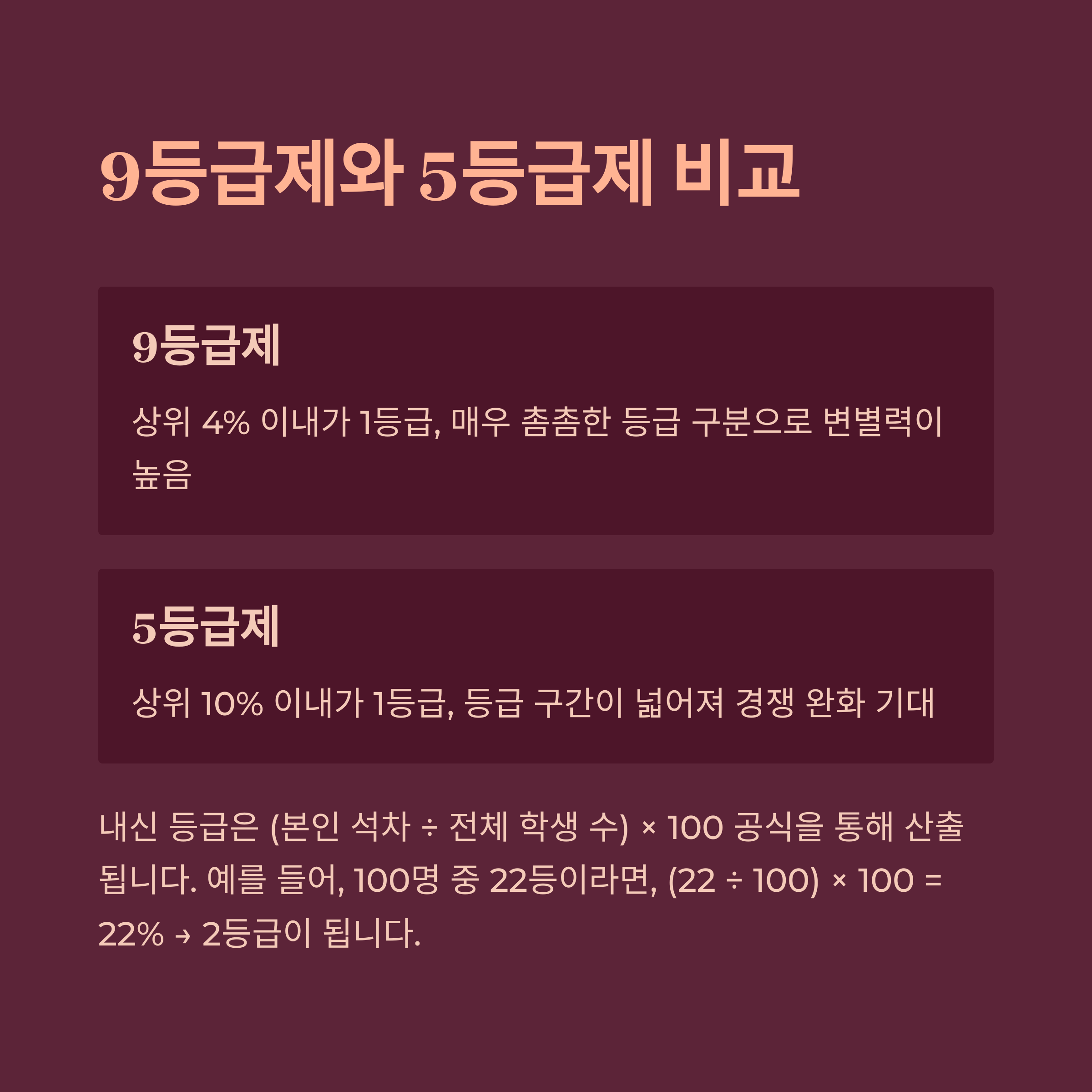9등급제는 학생 간 성적 차이를 매우 세밀하게 구분할 수 있었지만, 5등급제는 구간이 넓어져 변별력은 다소 낮아질 수 있습니다.