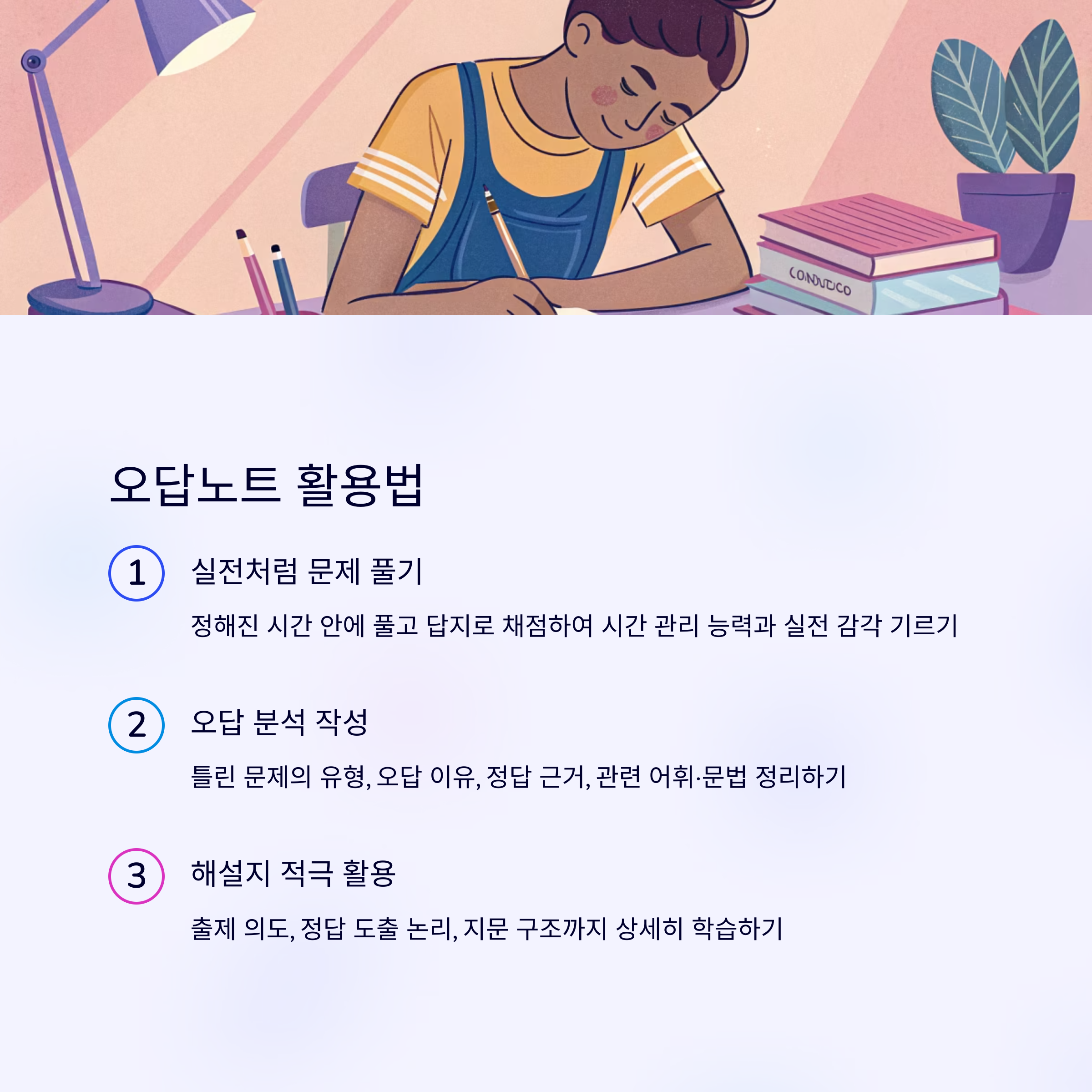 - 틀린 문제는 반드시 해설을 꼼꼼히 읽고, 왜 틀렸는지 이유를 스스로 정리해야 합니다.
