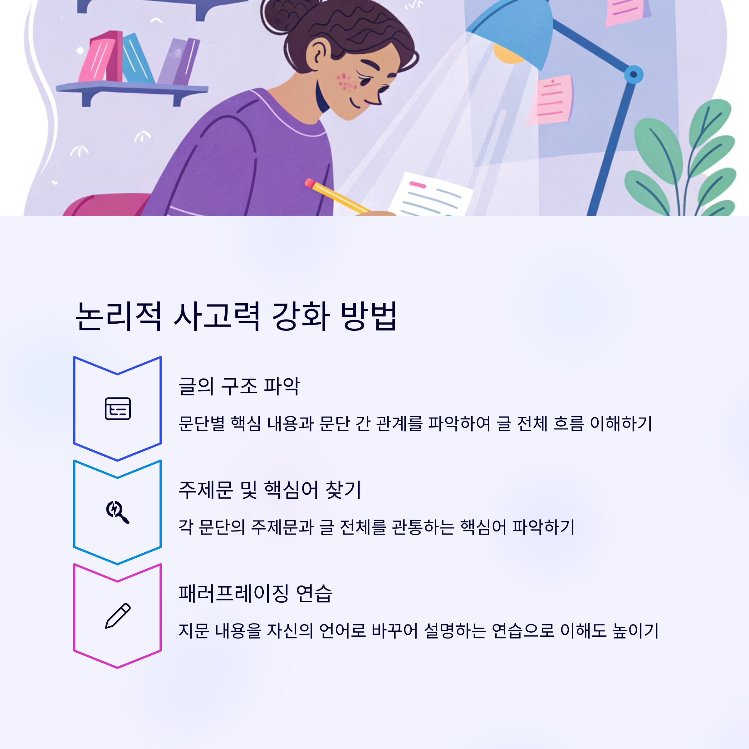 - 패러프레이징 연습: 지문의 내용을 자신의 언어로 바꾸어 설명하는 연습을 통해 이해도를 높이고 논리력을 향상시킵니다.