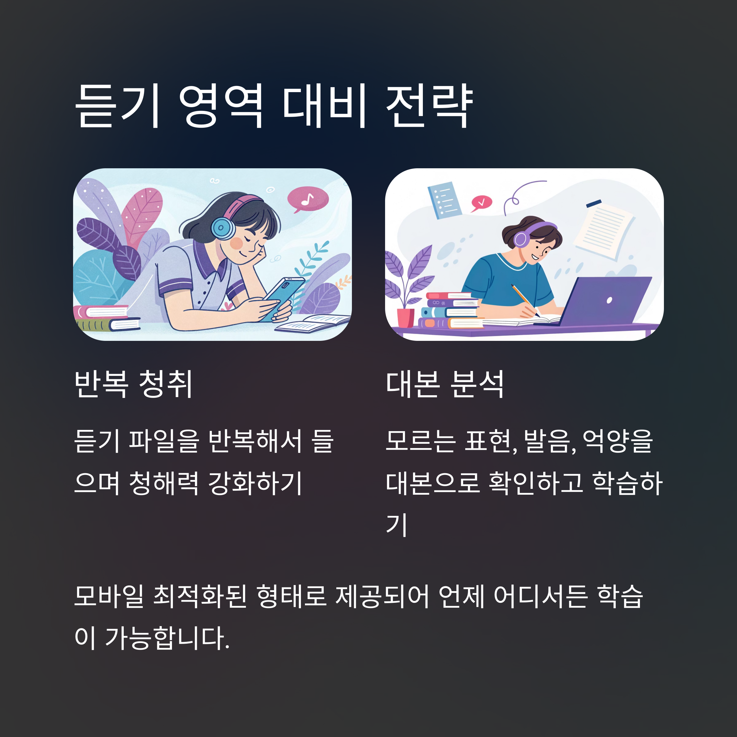 - 듣기 대본과 해설을 참고해 모르는 표현, 발음, 억양을 익히고, 반복 청취로 청해력을 강화하는 것이 중요합니다.