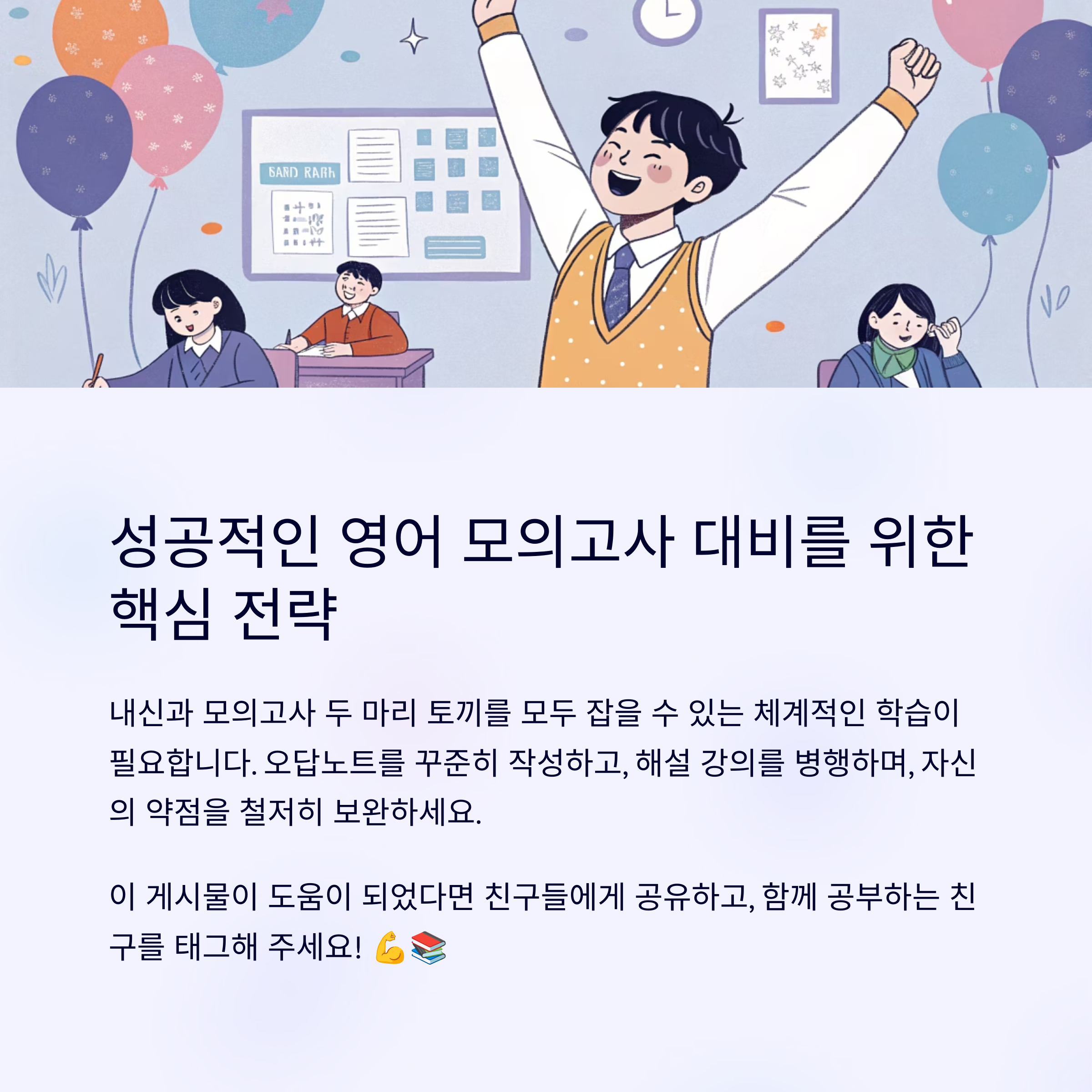 2025년 6월 고2 영어 모의고사는 학생들에게 상당한 도전이 되었지만, 동시에 앞으로의 학습 방향을 제시하는 중요한 시험이었습니다. 내신과 모의고사 두 마리 토끼를 모두 잡을 수 있는 학생이 입시에서 더 유리한 고지를 점할 수 있다는 점을 명심하며, 지속적이고 체계적인 학습이 필요합니다.