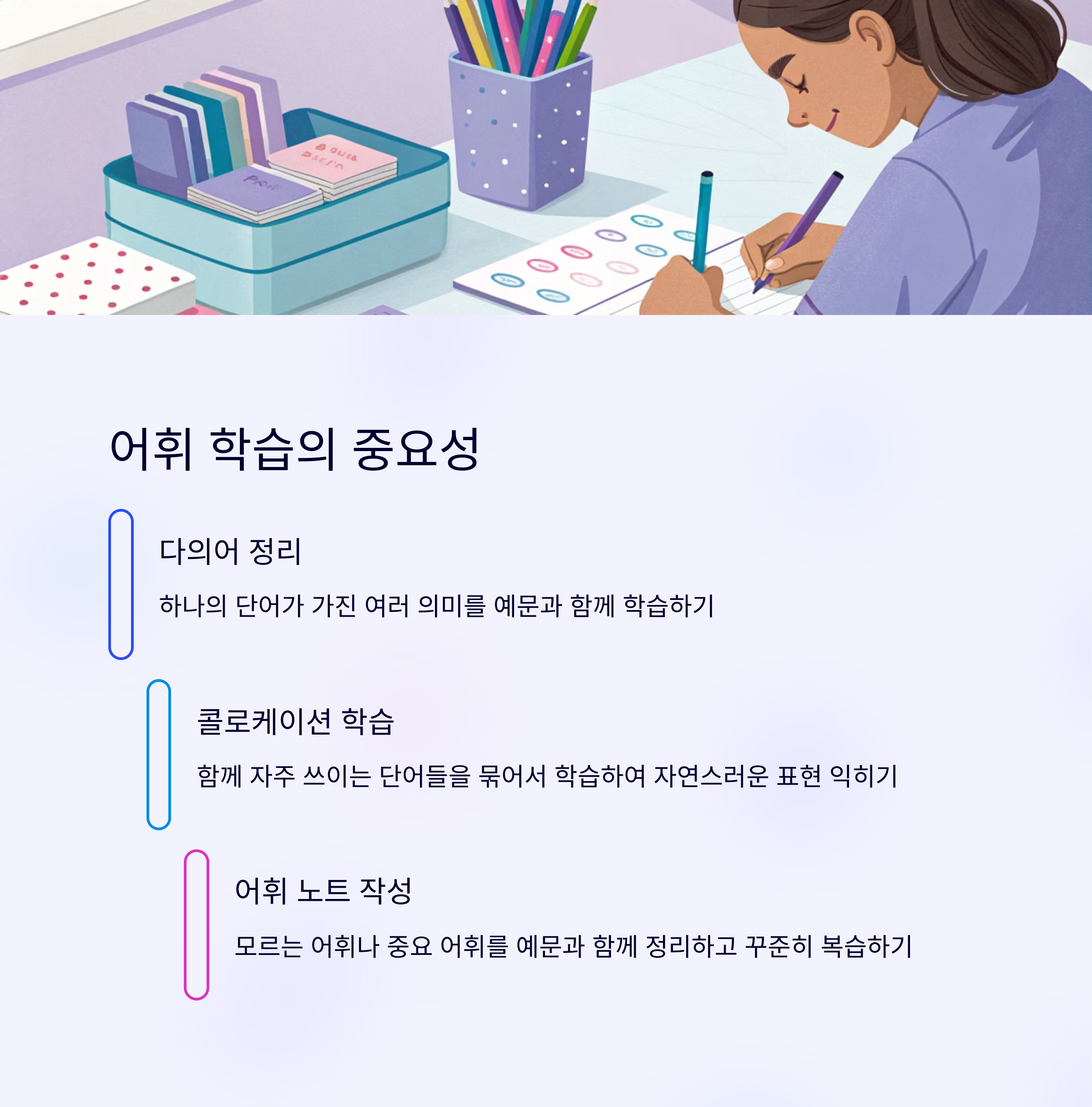 - 어휘 노트 작성: 모르는 어휘나 중요한 어휘는 자신만의 어휘 노트를 만들고, 예문과 함께 꾸준히 복습합니다.