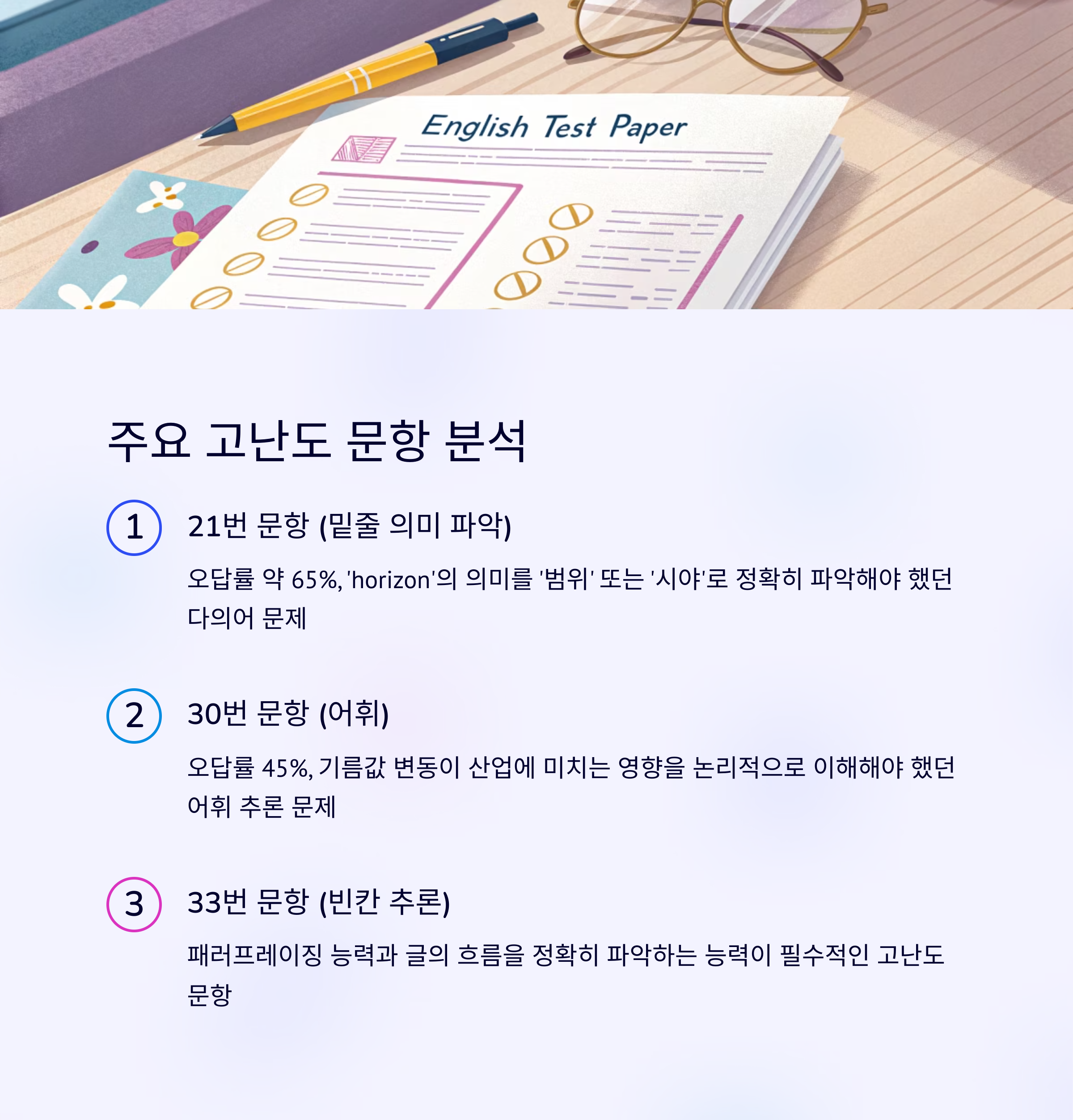 - 단순히 단어의 뜻을 아는 것을 넘어, 지문 전체의 흐름과 논리적 관계를 파악하여 문맥에 맞는 어휘를 선택하는 능력이 중요했습니다.