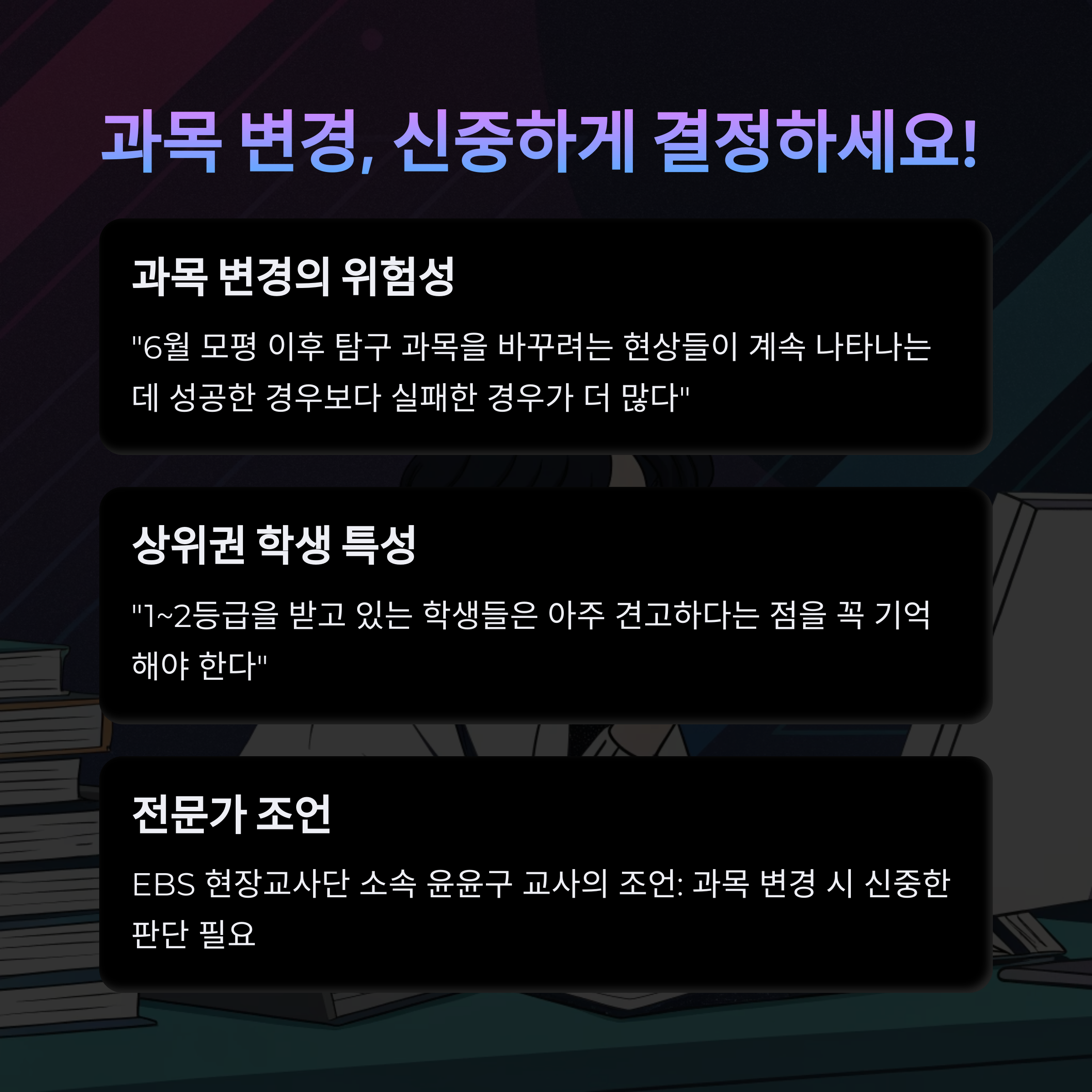 EBS 현장교사단은 “탐구 과목 변경은 신중해야 하며, 이미 1~2등급을 받고 있다면 과목을 바꿀 필요가 없다”고 조언합니다. 지금까지 쌓아온 실력을 믿고, 꾸준히 준비하는 것이 중요합니다.