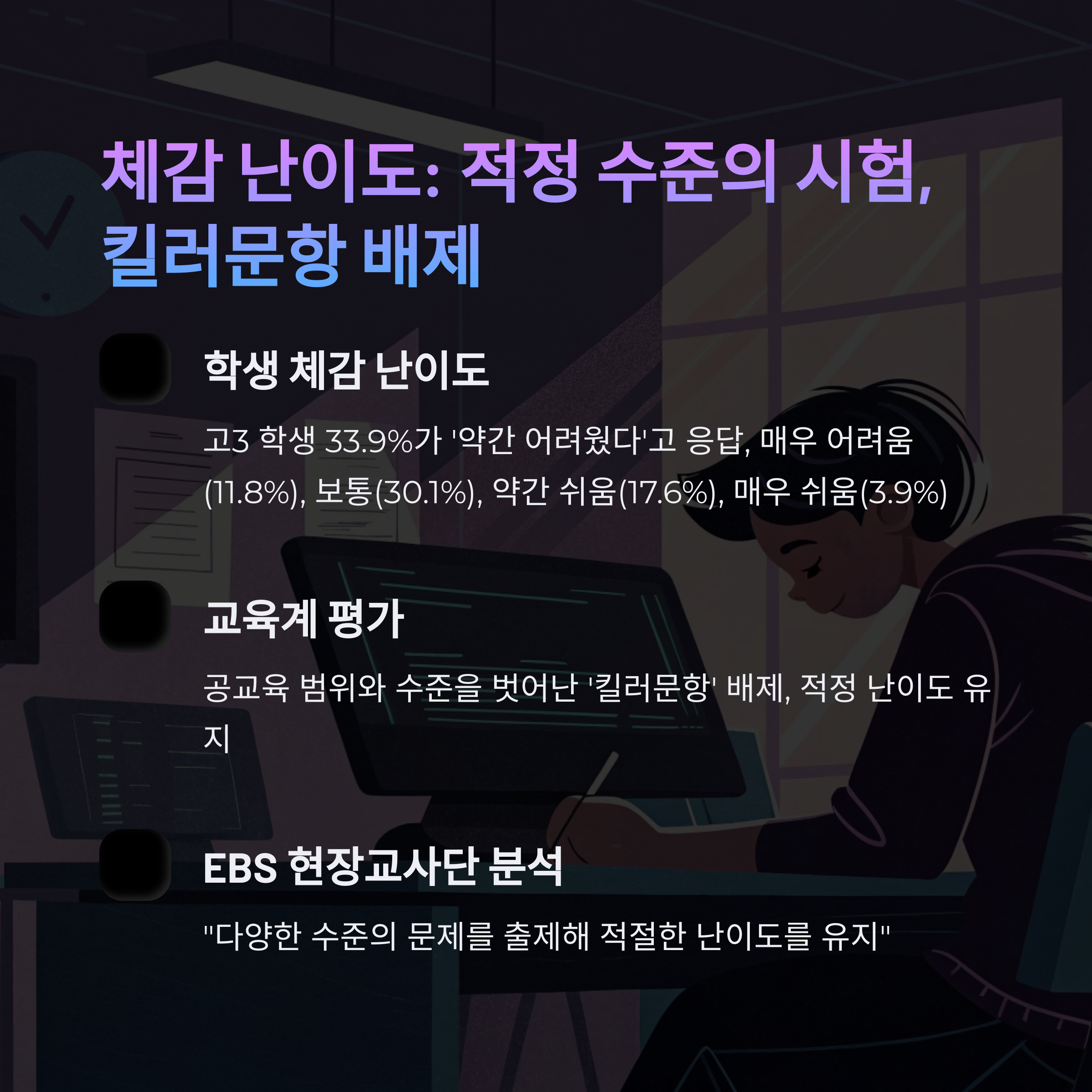 EBSi 조사 결과, 학생들의 33.9%가 ‘약간 어려웠다’고 답했습니다. 전체적으로는 적정 수준의 난이도를 유지했지만, 일부 문항에서 변별력이 있었다는 평가입니다.