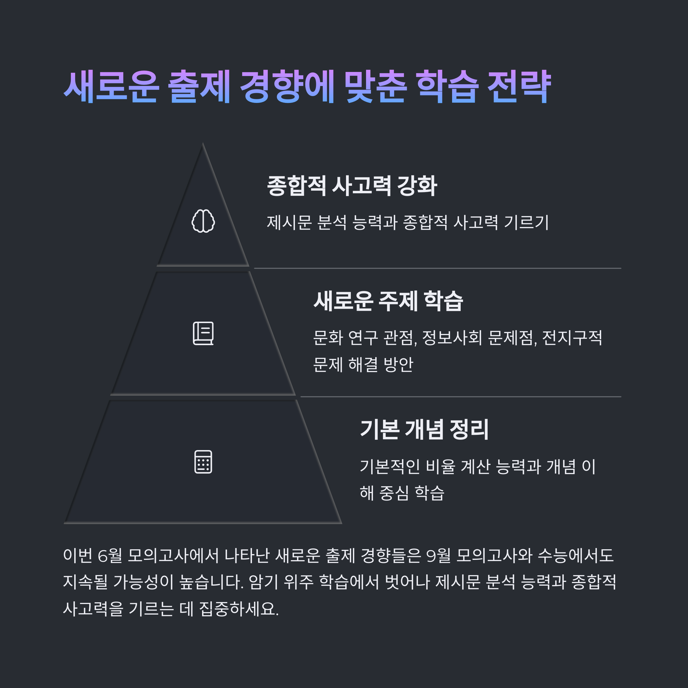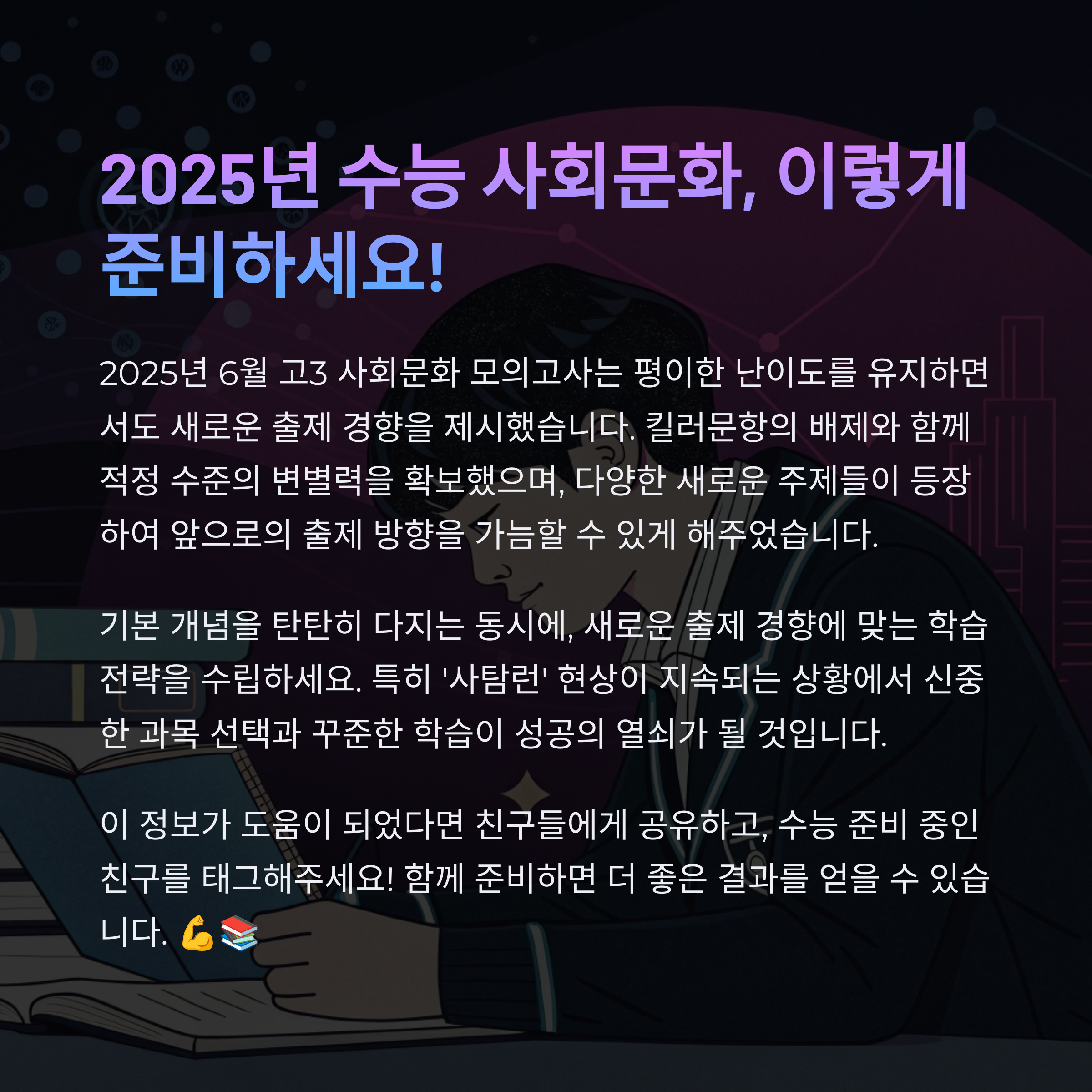 2025년 6월 모의고사는 평이한 난이도와 함께 새로운 출제 경향을 보여준 시험이었습니다. 앞으로도 기본 개념을 탄탄히 다지고, 신유형 문제에 대한 대비가 필요합니다. 사탐 선택 학생들은 과목 변경보다는 꾸준한 학습에 집중하세요!