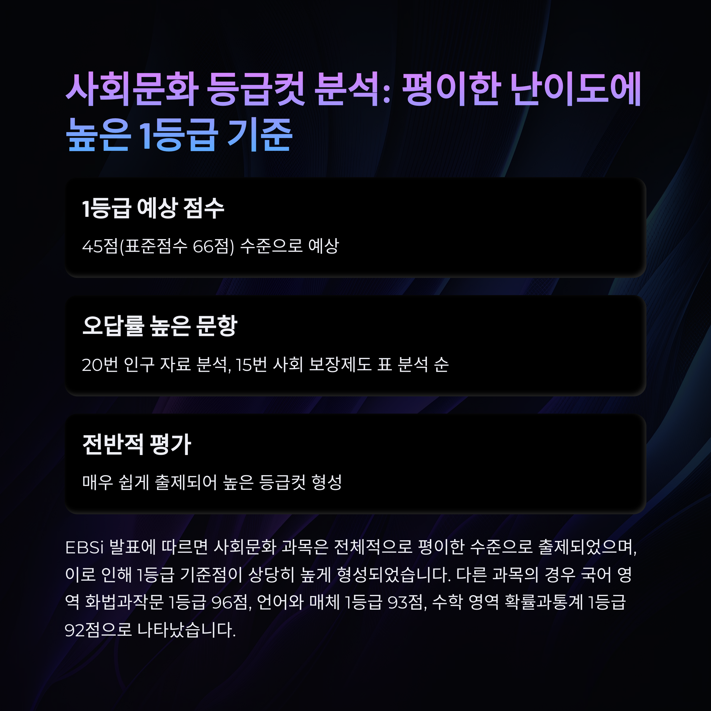 올해 사회문화 과목은 전체적으로 쉽게 출제되어 1등급 컷이 높게 형성되었습니다. 오답률이 높았던 문항은 20번 인구 자료 분석, 15번 사회 보장제도 표 분석, 2번 사회문화 현상 관점, 17번 진화론과 순환론, 18번 사회불평등 관점 등이었습니다.