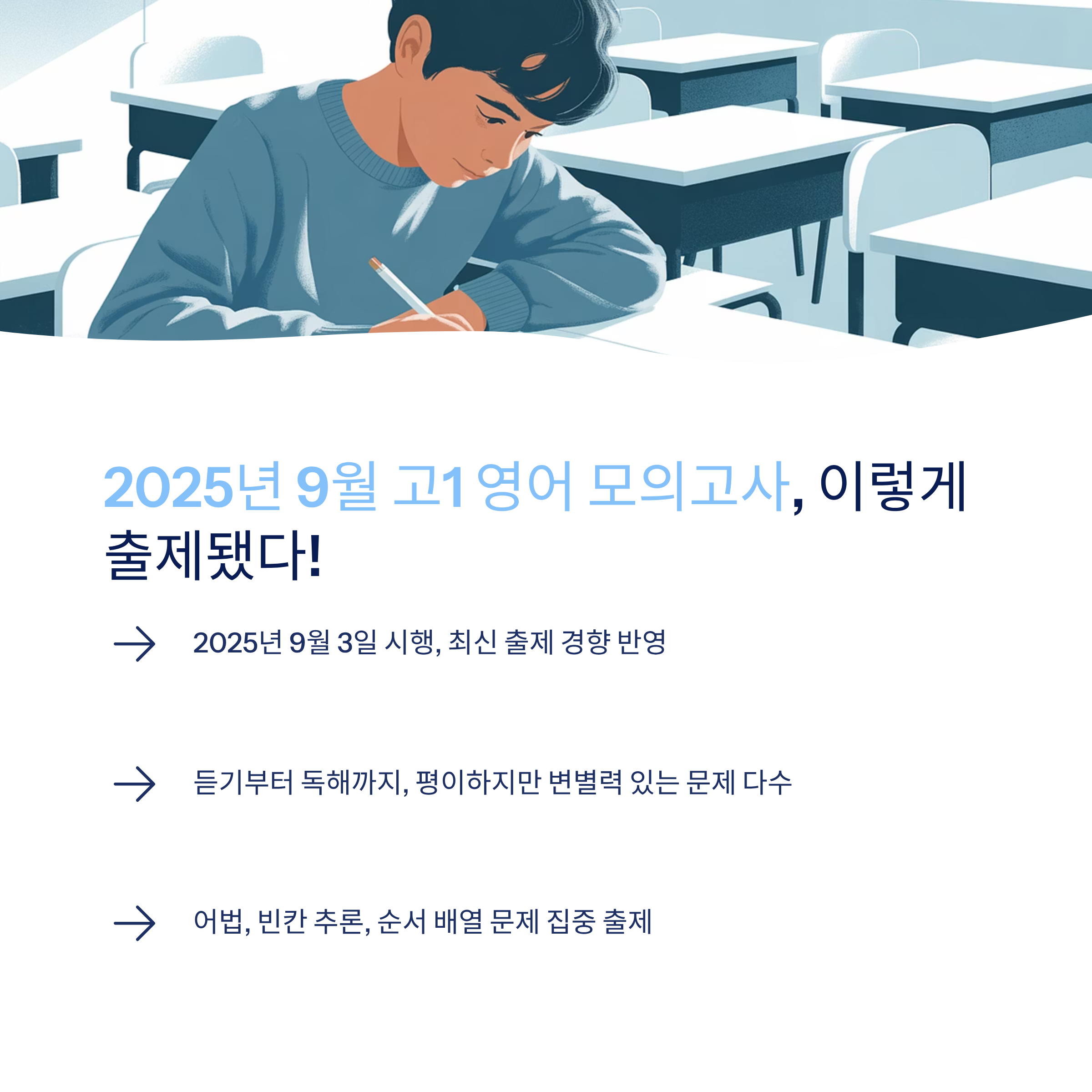 2025년 9월 시행된 고1 전국연합학력평가 영어 영역은 그동안의 학평과 비교해 확연히 높은 체감 난이도를 보였습니다. 지문 길이와 어휘 수준, 주제의 난이도까지 높아져 상위권과 중하위권의 점수 격차가 벌어졌다는 분석이 이어지고 있는데요. 이번 글에서는 2025년 9월 고1 영어 학평의 난이도, 주요 문항 분석, 그리고 향후 학습 전략까지 함께 짚어보겠습니다.