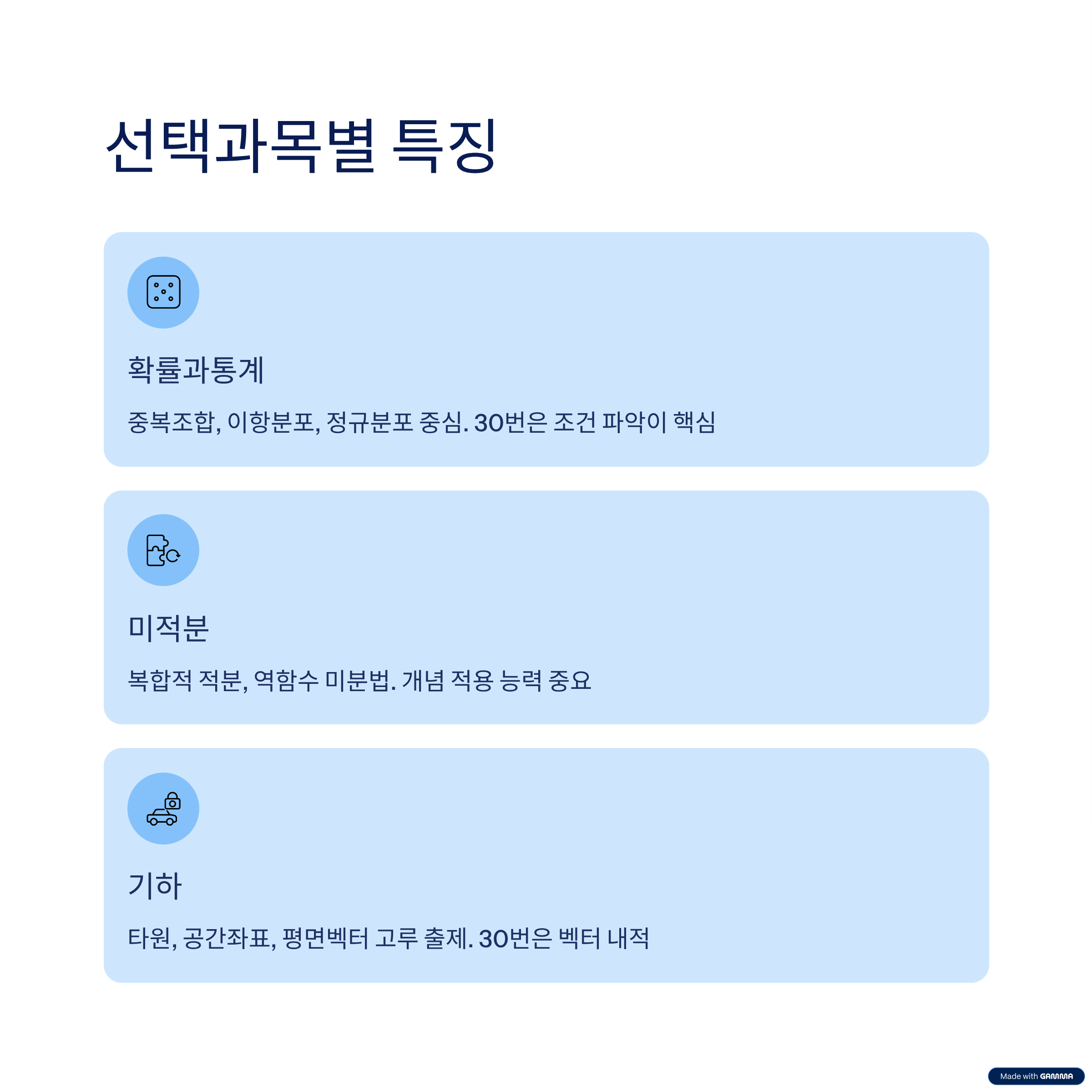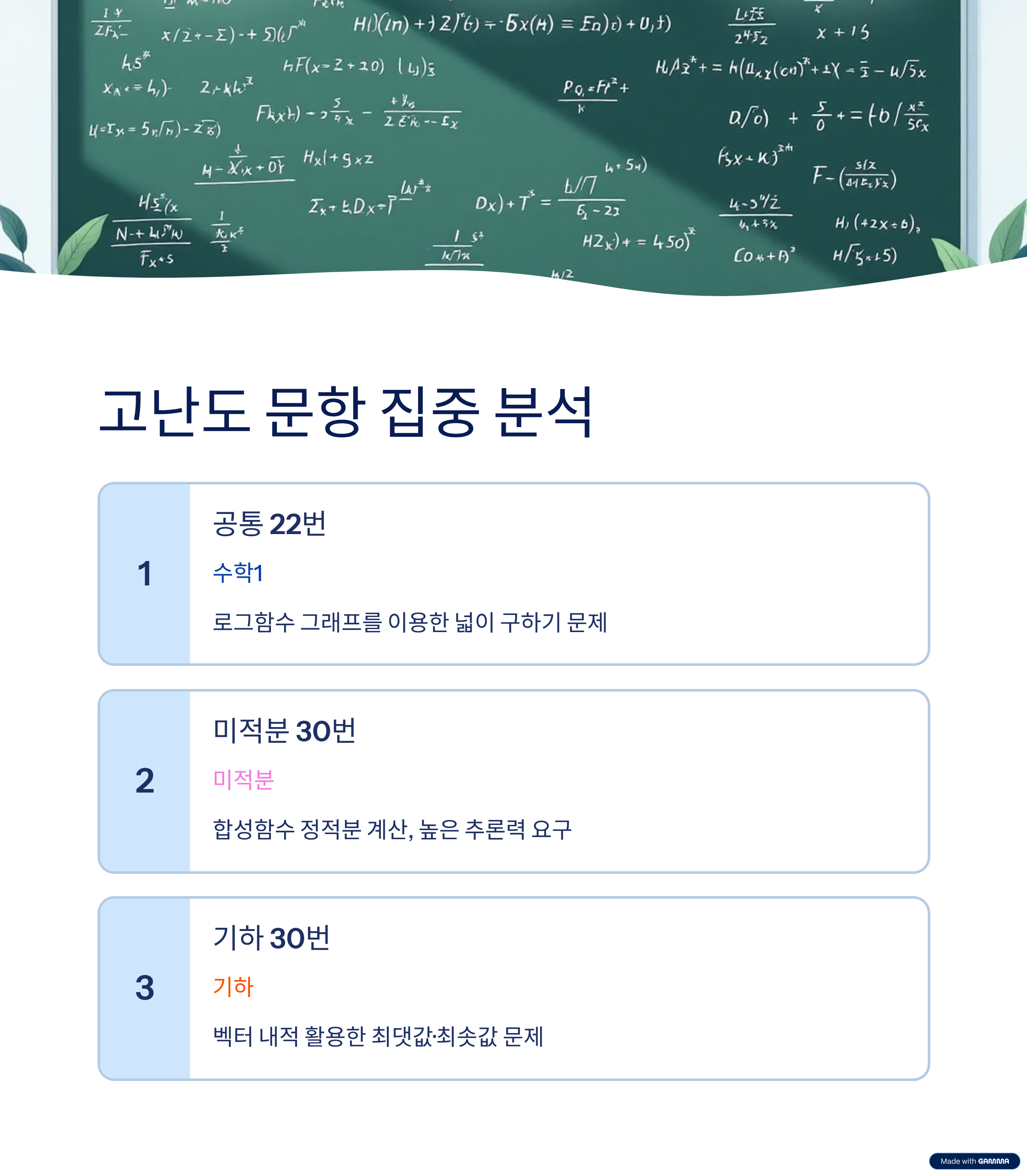 반면, 계산 과정이 복잡한 고난도 3점 문항은 시간 관리와 문제해결 전략이 반드시 필요했던 부분이었습니다.