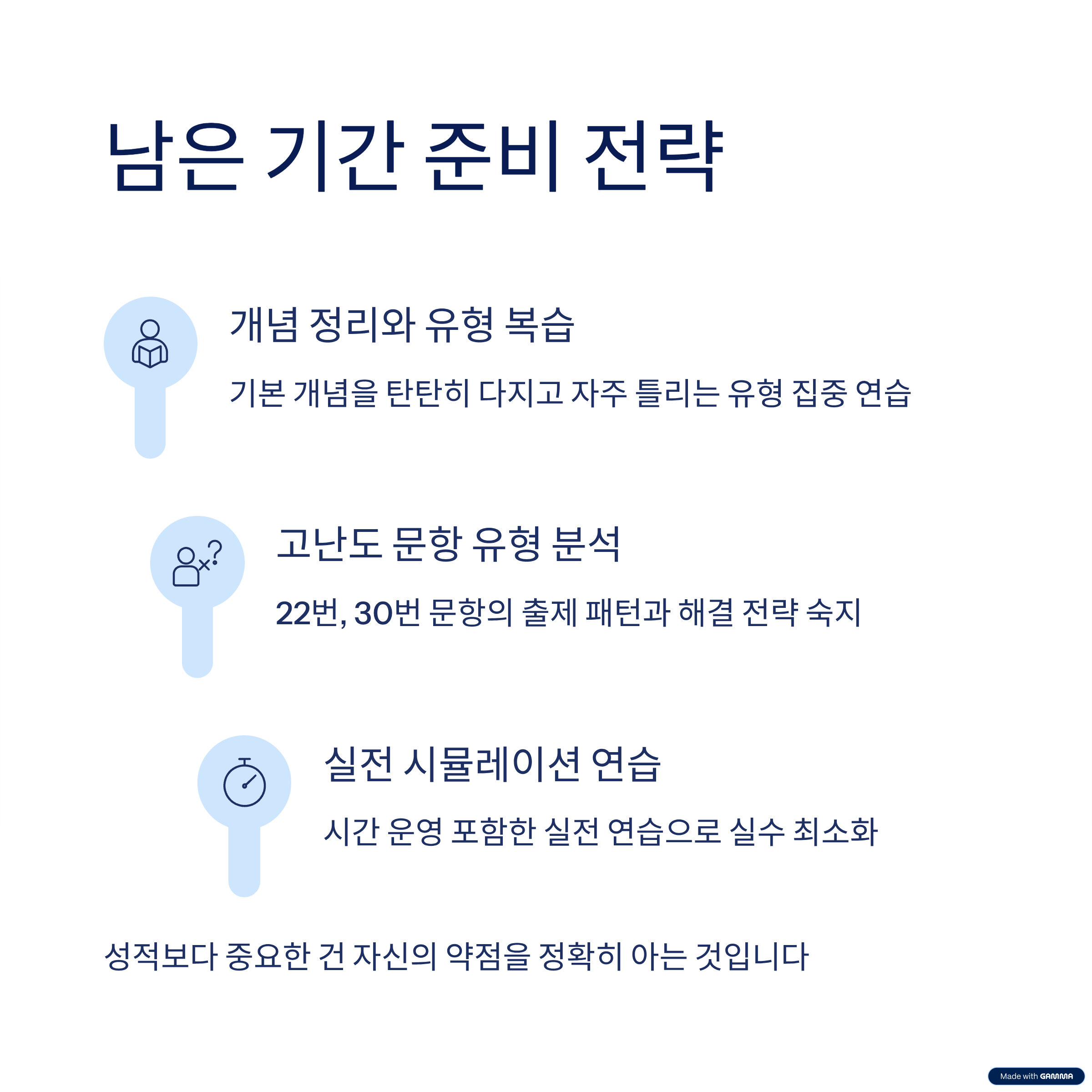 성적보다 중요한 건 자신의 약점을 정확히 아는 것입니다. 이제 남은 시간은 많지 않습니다. 전략적으로 움직여야 합니다.