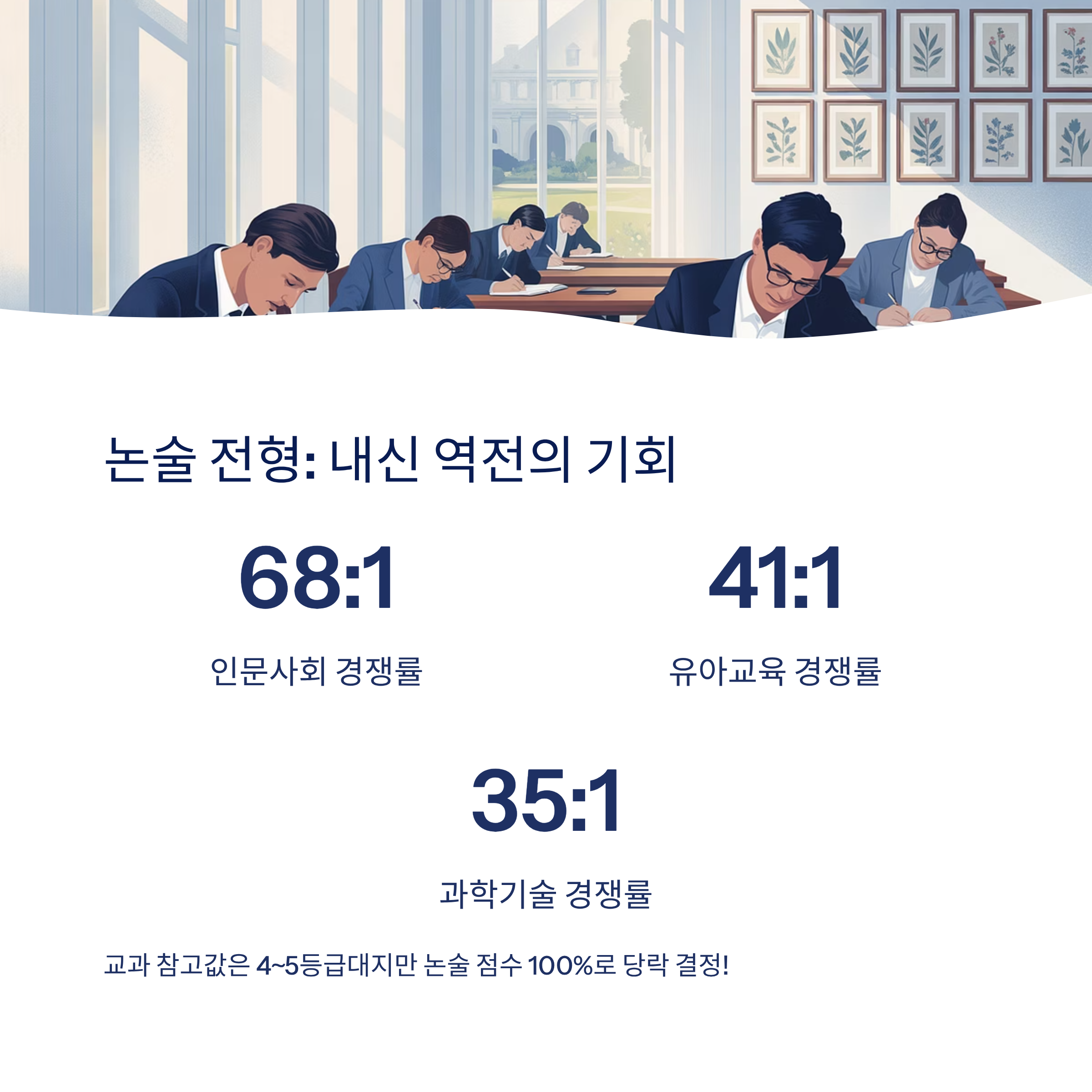 • 교과 참고값은 4~5등급대로 분포하지만, 실질 당락은 논술 점수 100%로 갈립니다.