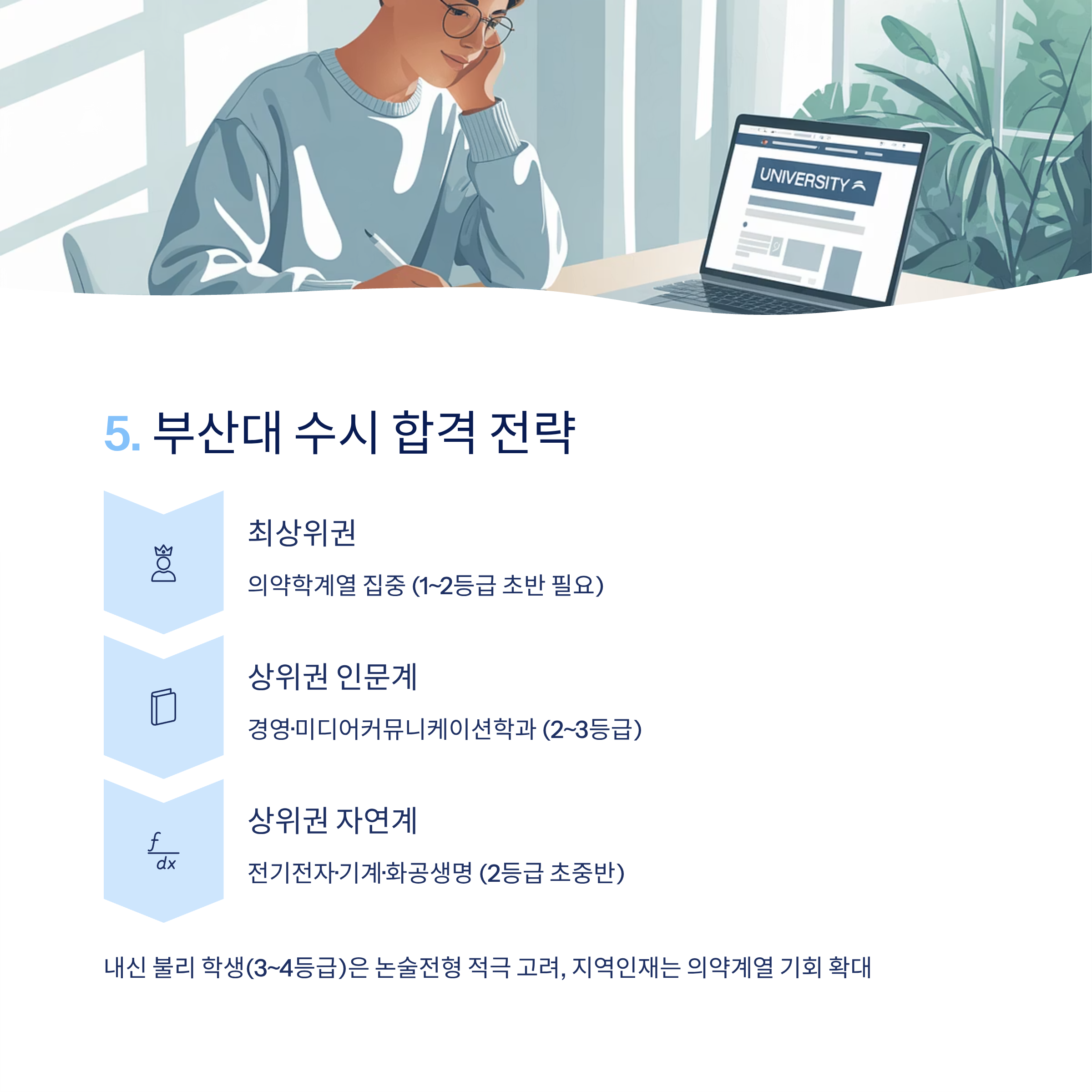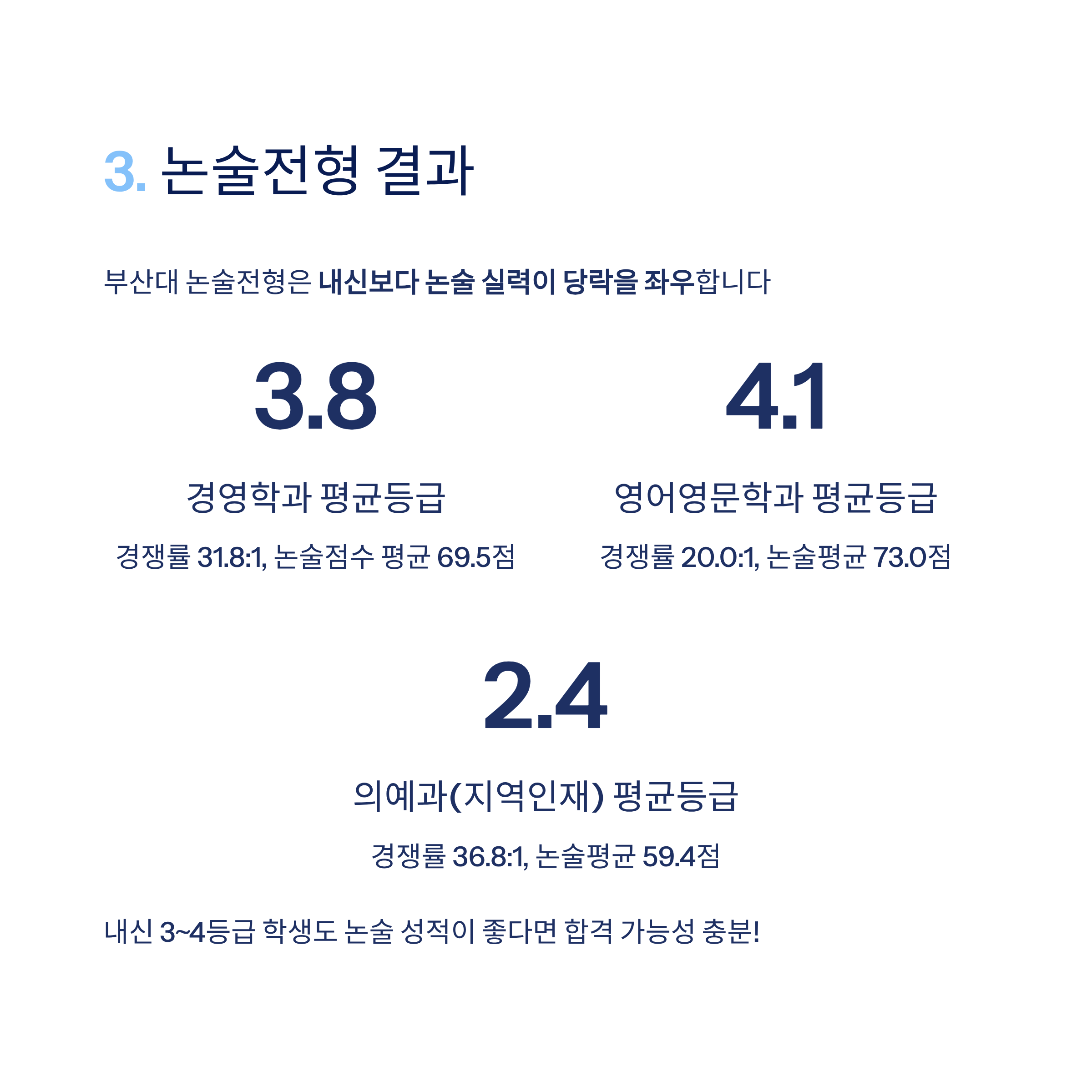 4. 내신 불리 학생(3~4등급) → 부산대 논술전형 적극 고려 (논술 실력이 합격 당락 좌우)