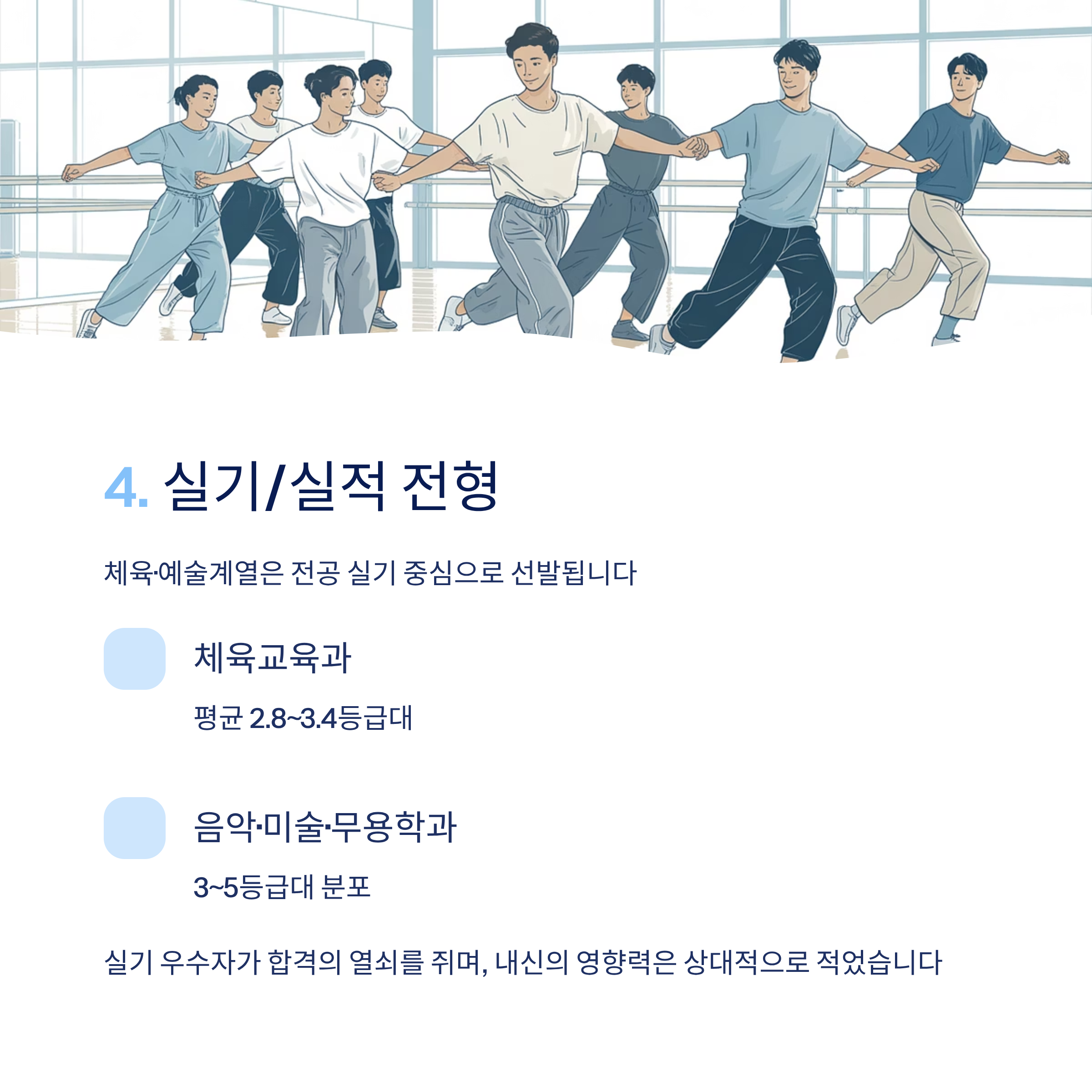 체육·예술계열은 전공 실기 중심으로 선발됩니다.
