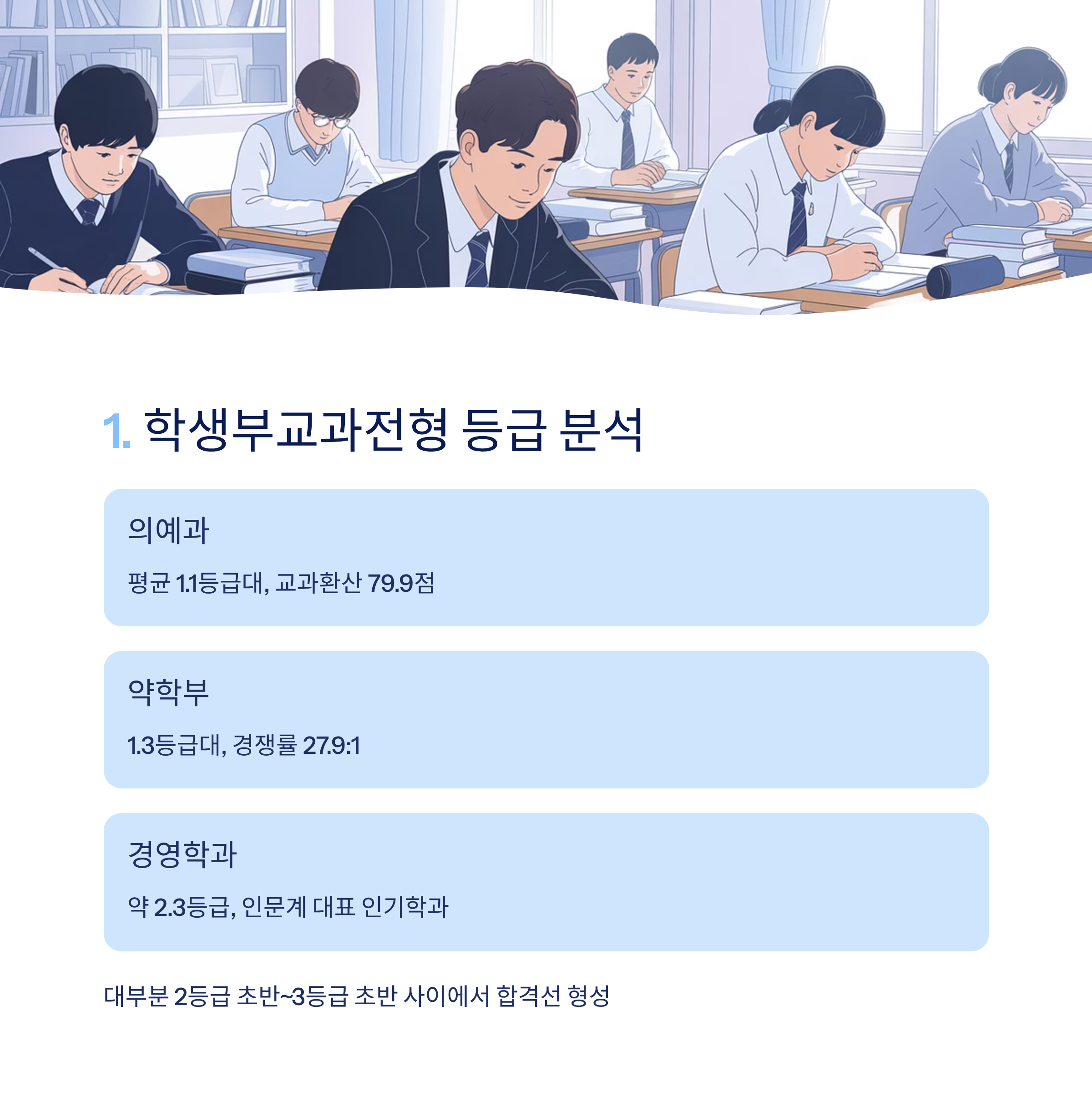 👉 의예과·약학부는 모든 전형에서 최상위 합격선을 기록했고, 경영·미디어·전자·컴공은 전형에 따라 2~3등급 분포로 차이가 있었습니다.