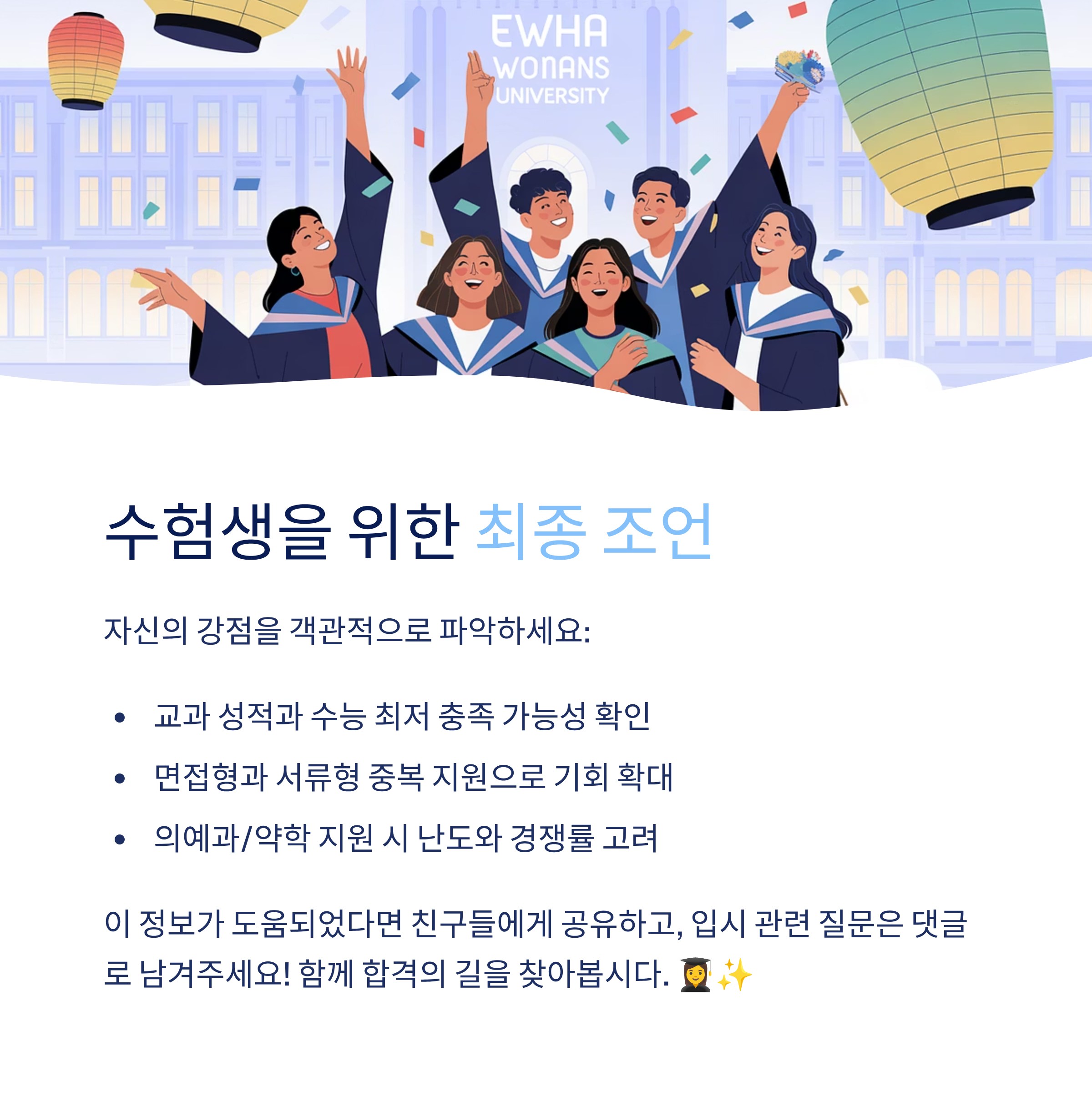2025학년도 이화여대 수시 전형은 교과·종합·논술에서 모두 큰 변화를 맞이했습니다. 교과전형은 면접을 폐지하고 수능 최저를 신설했으며, 종합전형은 서류형과 면접형으로 이원화해 선택의 폭을 넓혔습니다. 또한 논술전형에서는 의예과를 새롭게 선발해 주목을 끌고 있습니다. 이번 글에서는 전형별 특징, 합격선 전망, 전략적인 지원 포인트를 정리해 드리겠습니다.