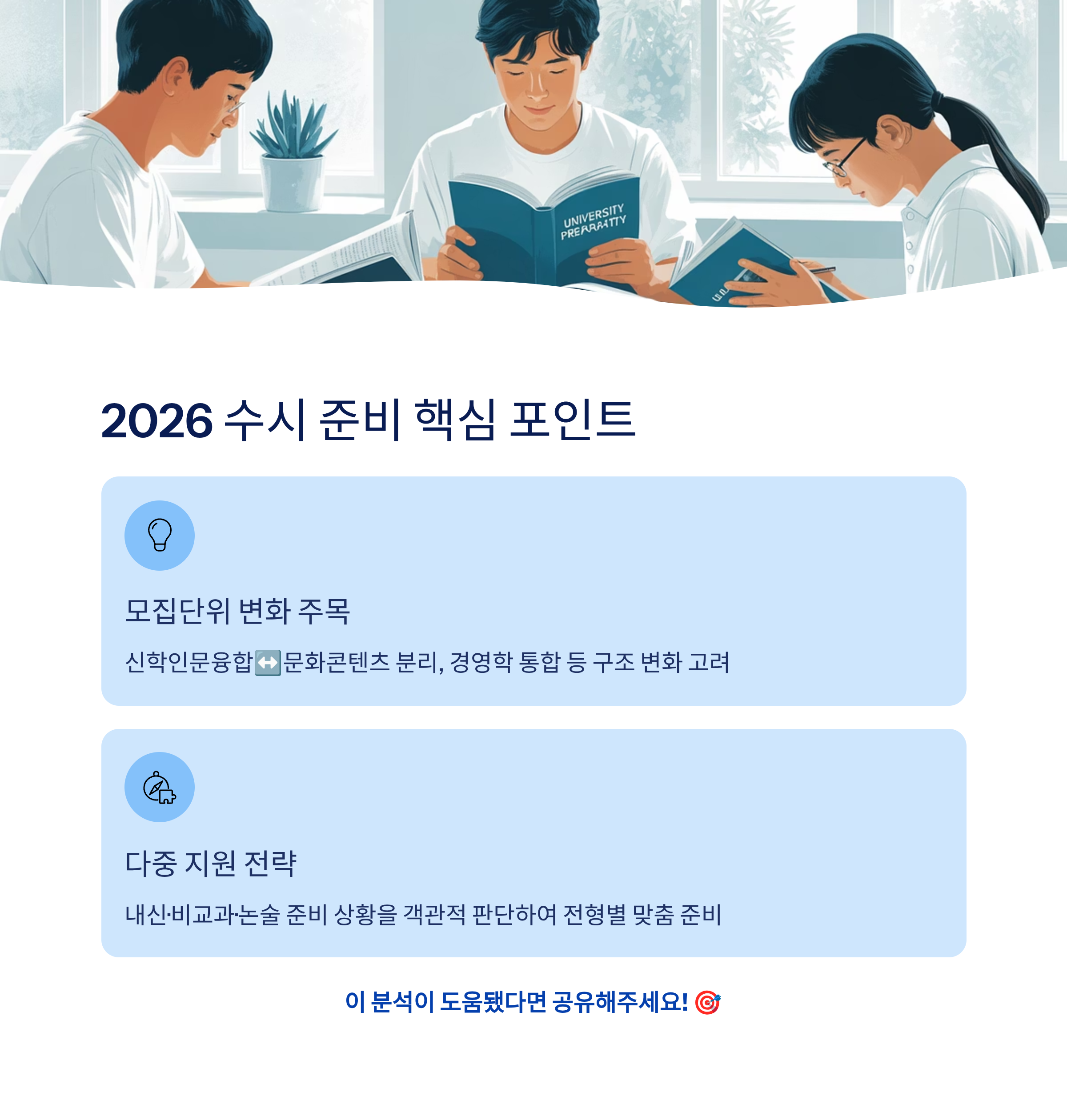 • 모집단위가 바뀌면 경쟁률과 합격선도 변동될 수 있으므로, 전년도 자료를 참고할 때 구조 변화까지 고려해야 합니다.