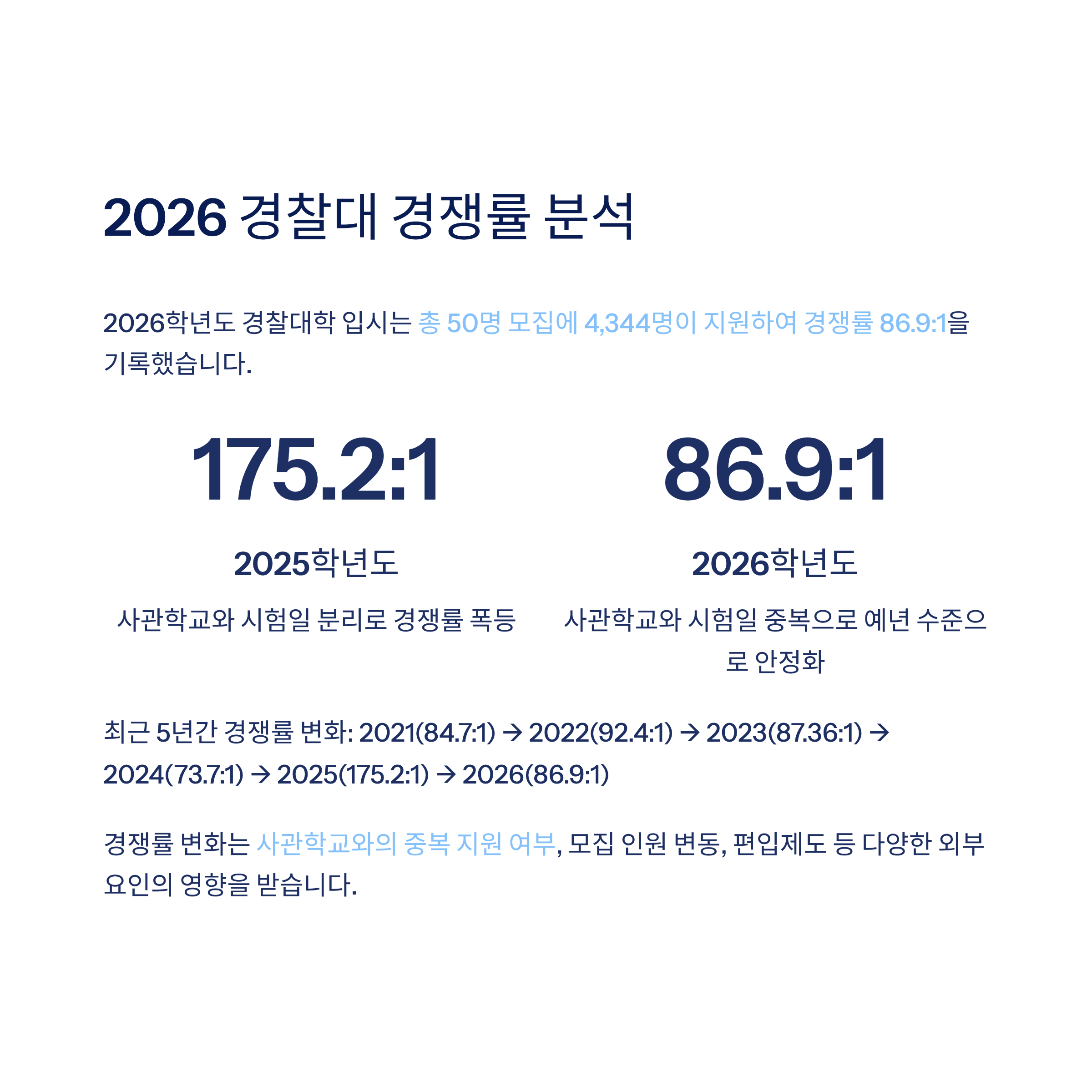 2026학년도 경찰대학 입시는 총 50명 모집에 4,344명이 지원, 경쟁률 86.9:1을 기록했습니다. 전년도인 2025학년도에는 사관학교와 시험일이 분리되면서 경쟁률이 175.2:1로 폭등했으나, 2026학년도부터 시험일이 겹치며 다시 예년 수준으로 안정되었습니다.