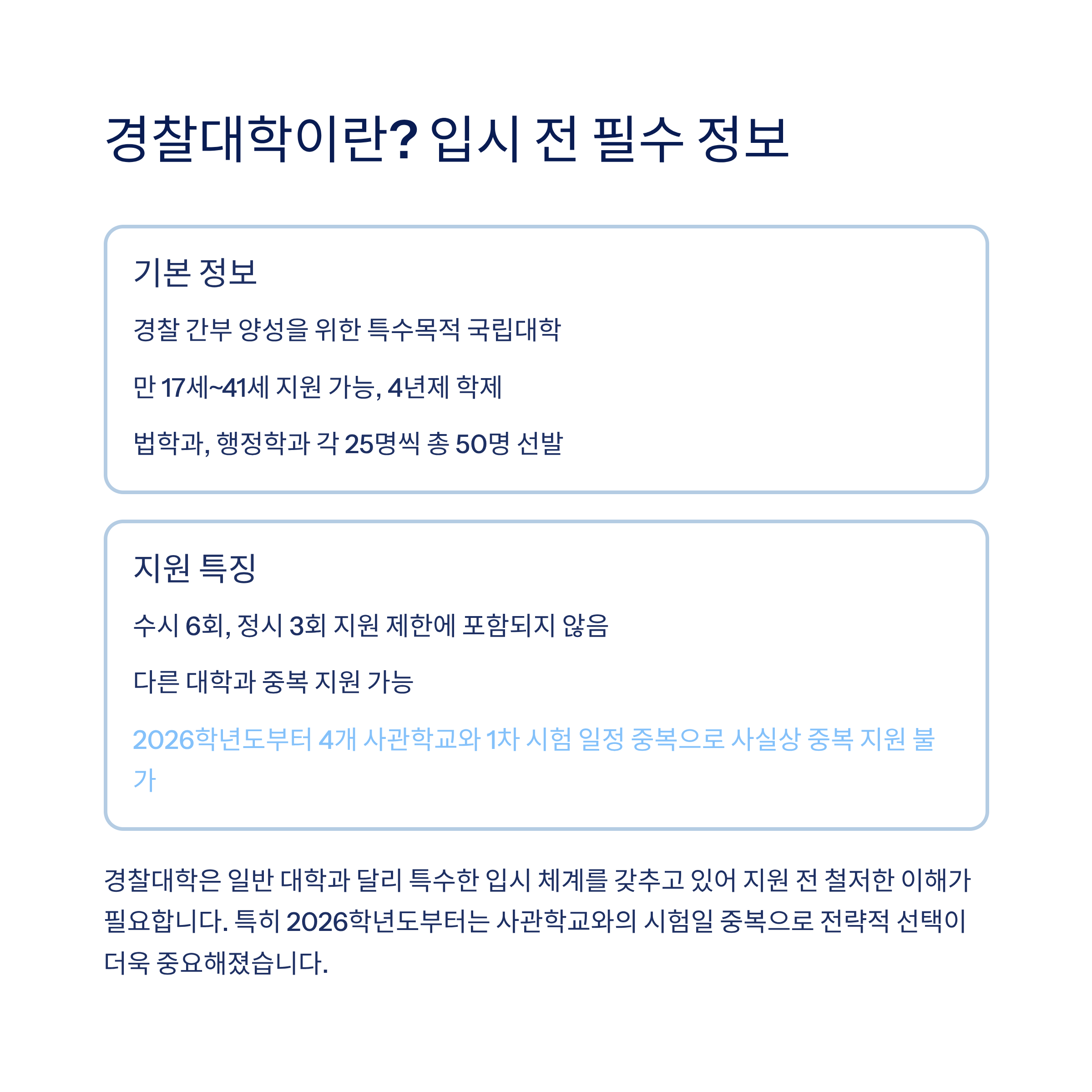경찰대학은 일반 대학들과 달리, 수시 6회 및 정시 3회 지원 횟수 제한에 포함되지 않습니다. 따라서 다른 대학에 지원하더라도 별도로 중복 지원이 가능합니다. 단, 2026학년도부터는 4개 사관학교(육사, 해사, 공사, 국간사)와 1차 시험 일정이 겹쳐 중복 지원이 사실상 불가능해졌습니다. 이 점은 전략적으로 큰 변수입니다.