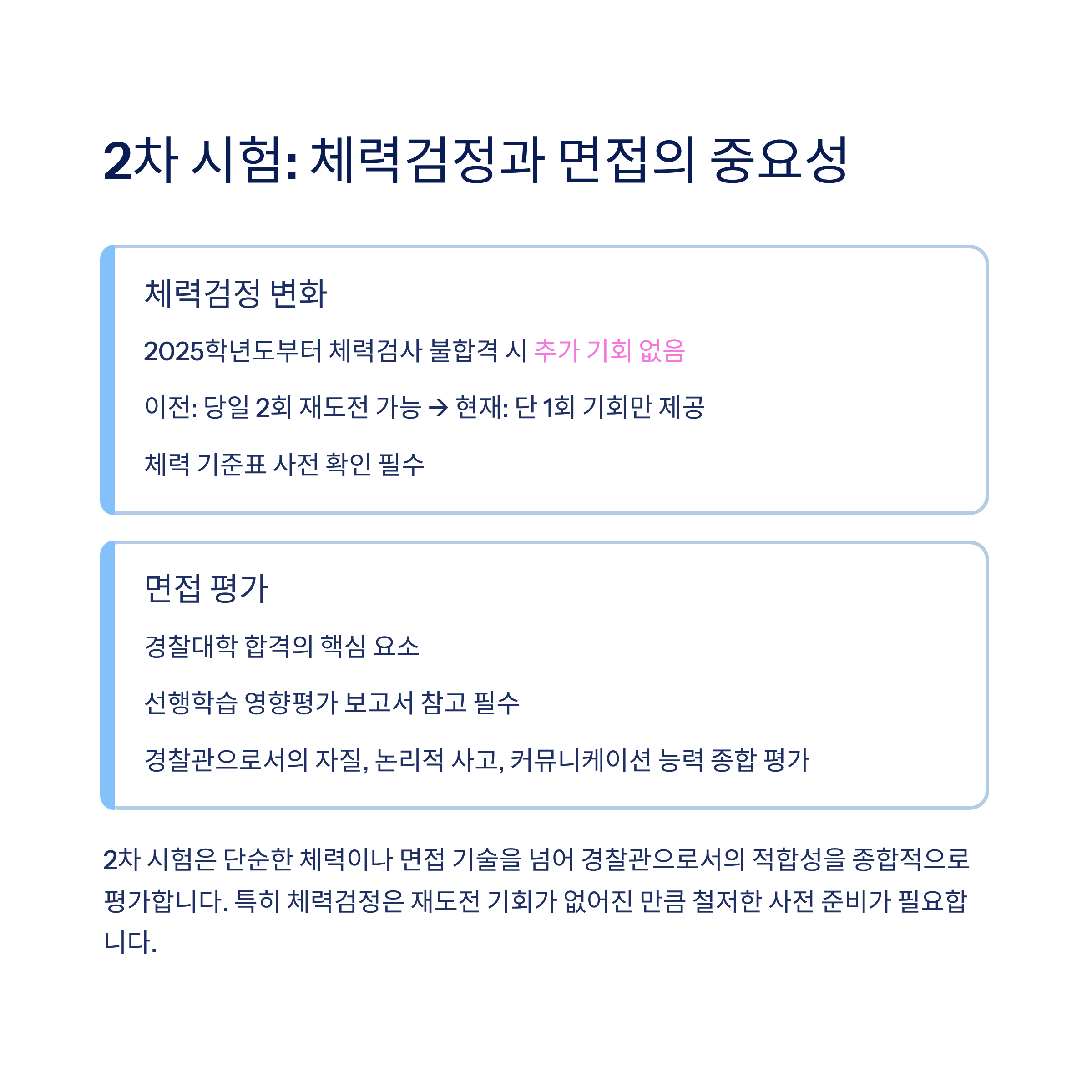 2025학년도부터는 체력검사에서 불합격 시 추가 기회가 주어지지 않습니다. 이전에는 순환식 체력검사에서 당일 2회까지 재도전이 가능했지만, 이제는 단 1회의 기회만 주어집니다. 수험생은 사전에 체력 기준표를 반드시 확인하고, 준비 부족으로 탈락하는 일이 없도록 해야 합니다.