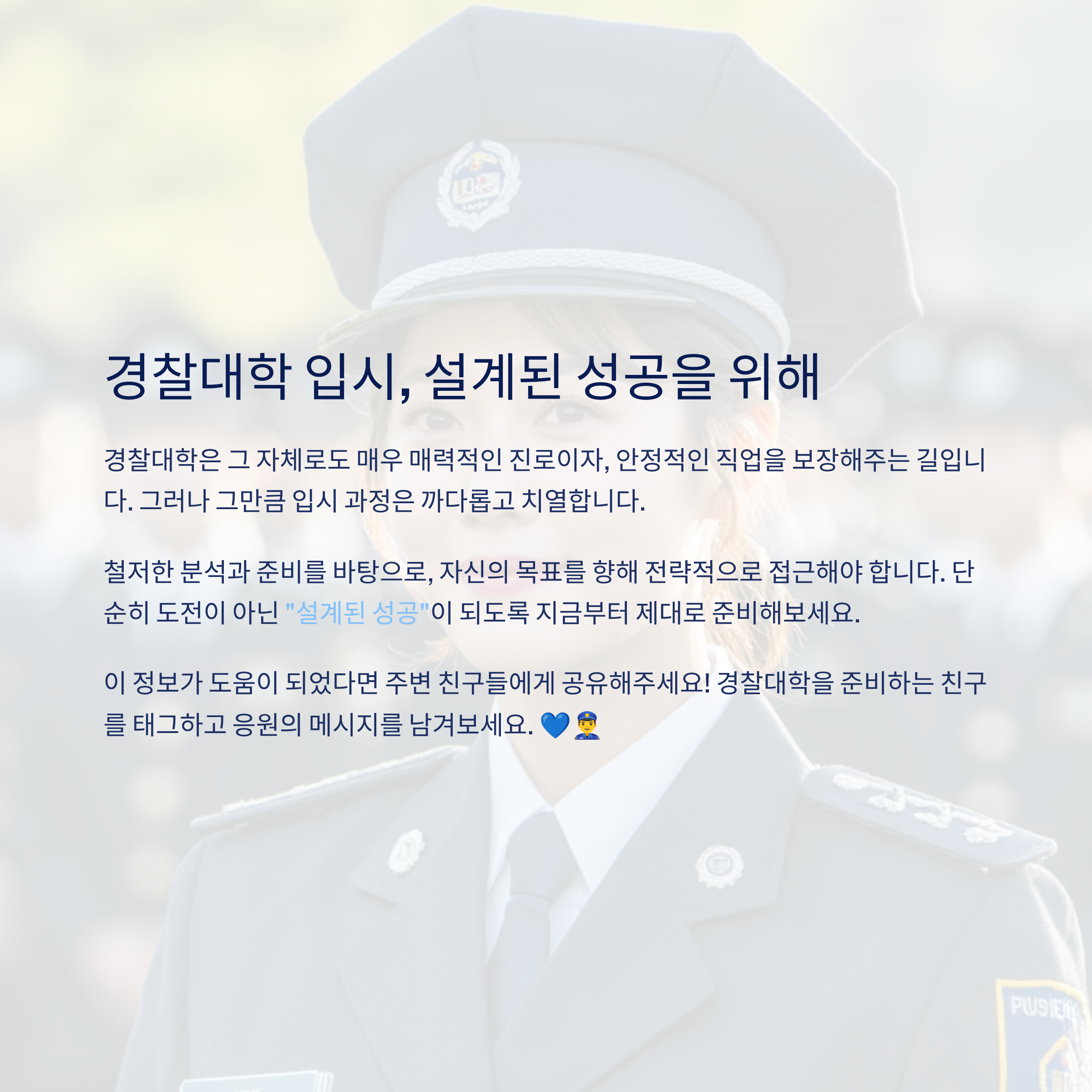 경찰대학은 그 자체로도 매우 매력적인 진로이자, 안정적인 직업을 보장해주는 길입니다. 그러나 그만큼 입시 과정은 까다롭고 치열합니다. 철저한 분석과 준비를 바탕으로, 자신의 목표를 향해 전략적으로 접근해야 합니다.