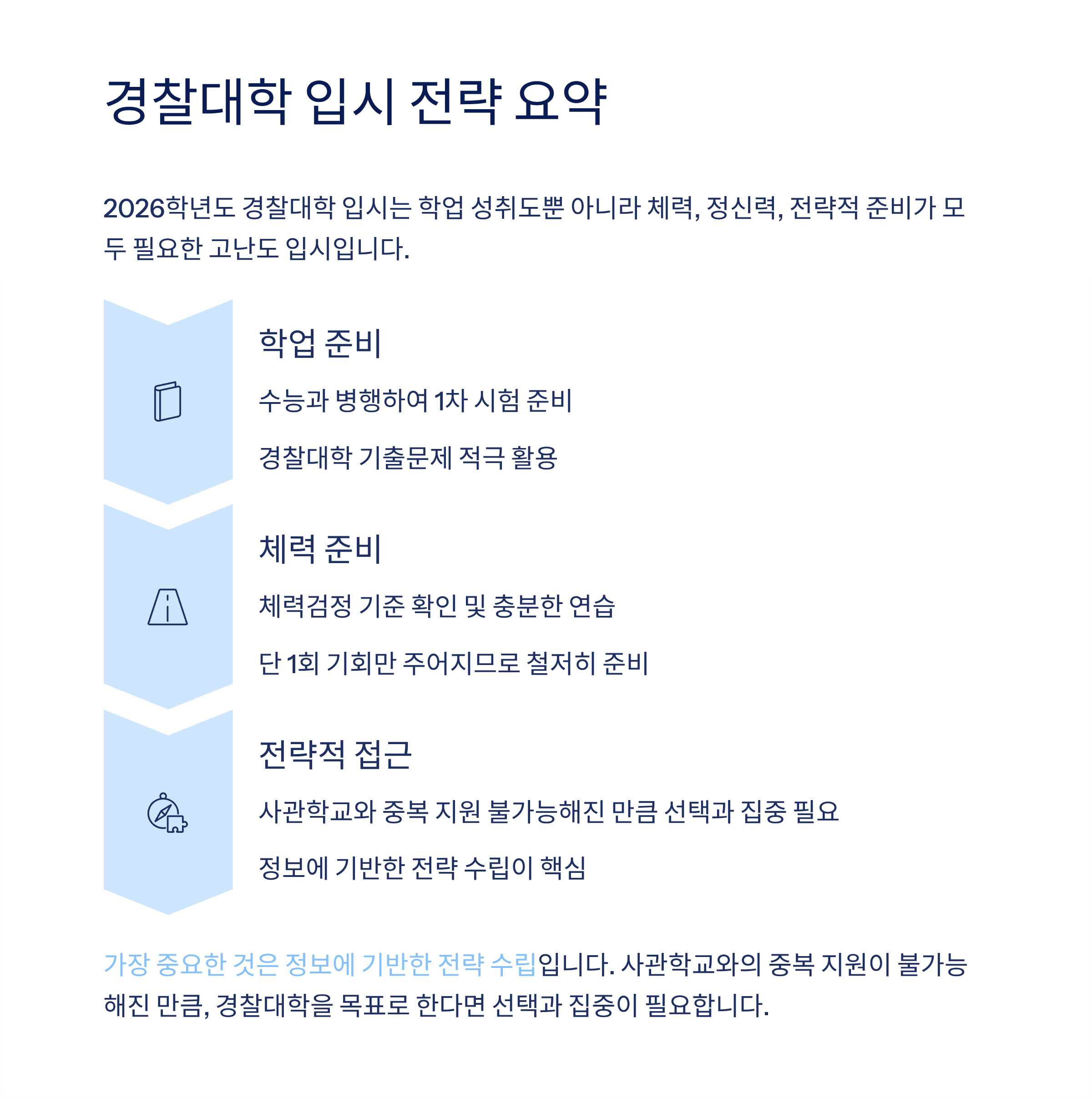 가장 중요한 것은 정보에 기반한 전략 수립입니다. 사관학교와의 중복 지원이 불가능해진 만큼, 경찰대학을 목표로 한다면 선택과 집중이 필요합니다.
