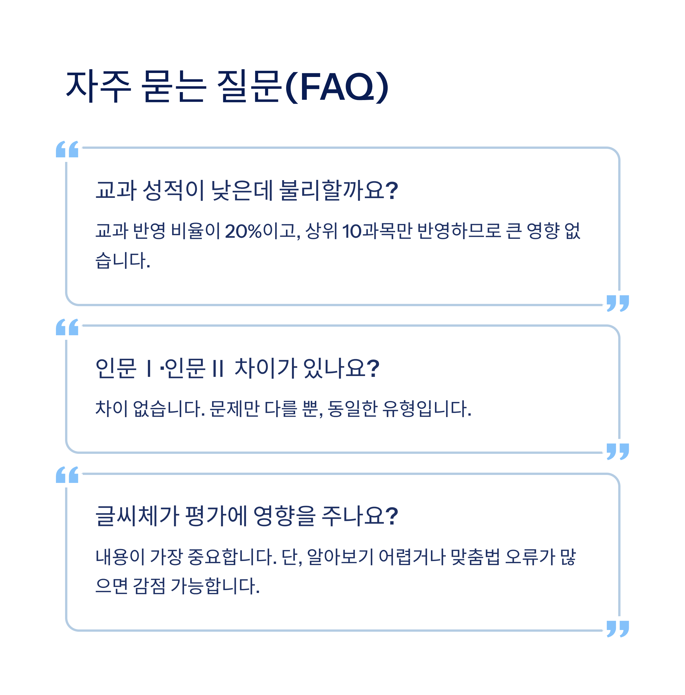 → 교과 반영 비율이 20%이고, 상위 10과목만 반영하므로 큰 영향 없음. - Q. 인문Ⅰ·인문Ⅱ 차이가 있나요?