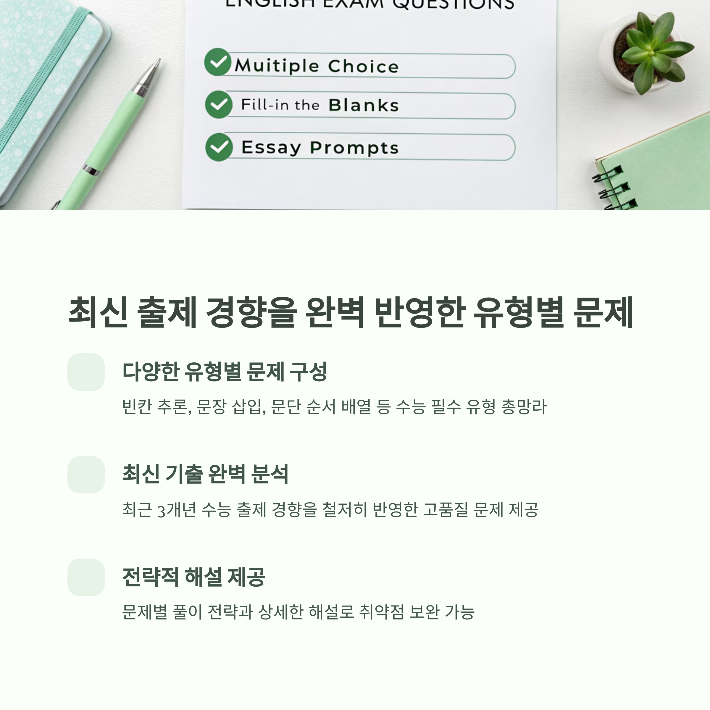 최신 출제 경향을 바탕으로 유형별 문제를 반복 학습하고, 실전 모의고사로 자신의 약점을 보완해나간다면 수능 영어 고득점은 결코 먼 이야기가 아닙니다.