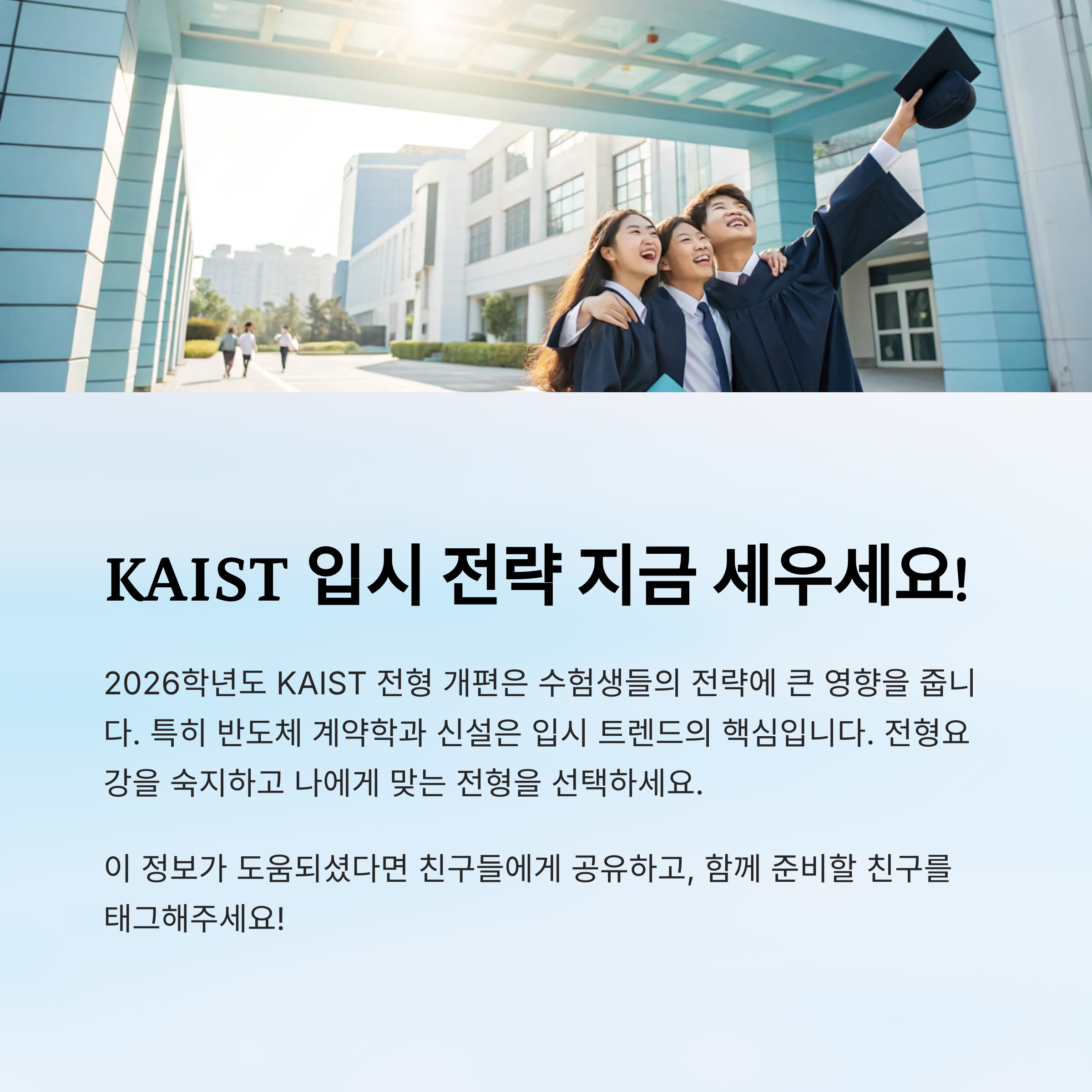 KAIST의 2026학년도 전형 개편은 수험생들의 전략에 큰 영향을 줄 수밖에 없습니다. 특히 반도체 계약학과 신설은 입시 트렌드의 핵심으로 떠오르고 있습니다. 반드시 전형요강을 숙지하고, 나에게 맞는 전형을 선택하는 것이 무엇보다 중요합니다. 지금부터 준비하세요!