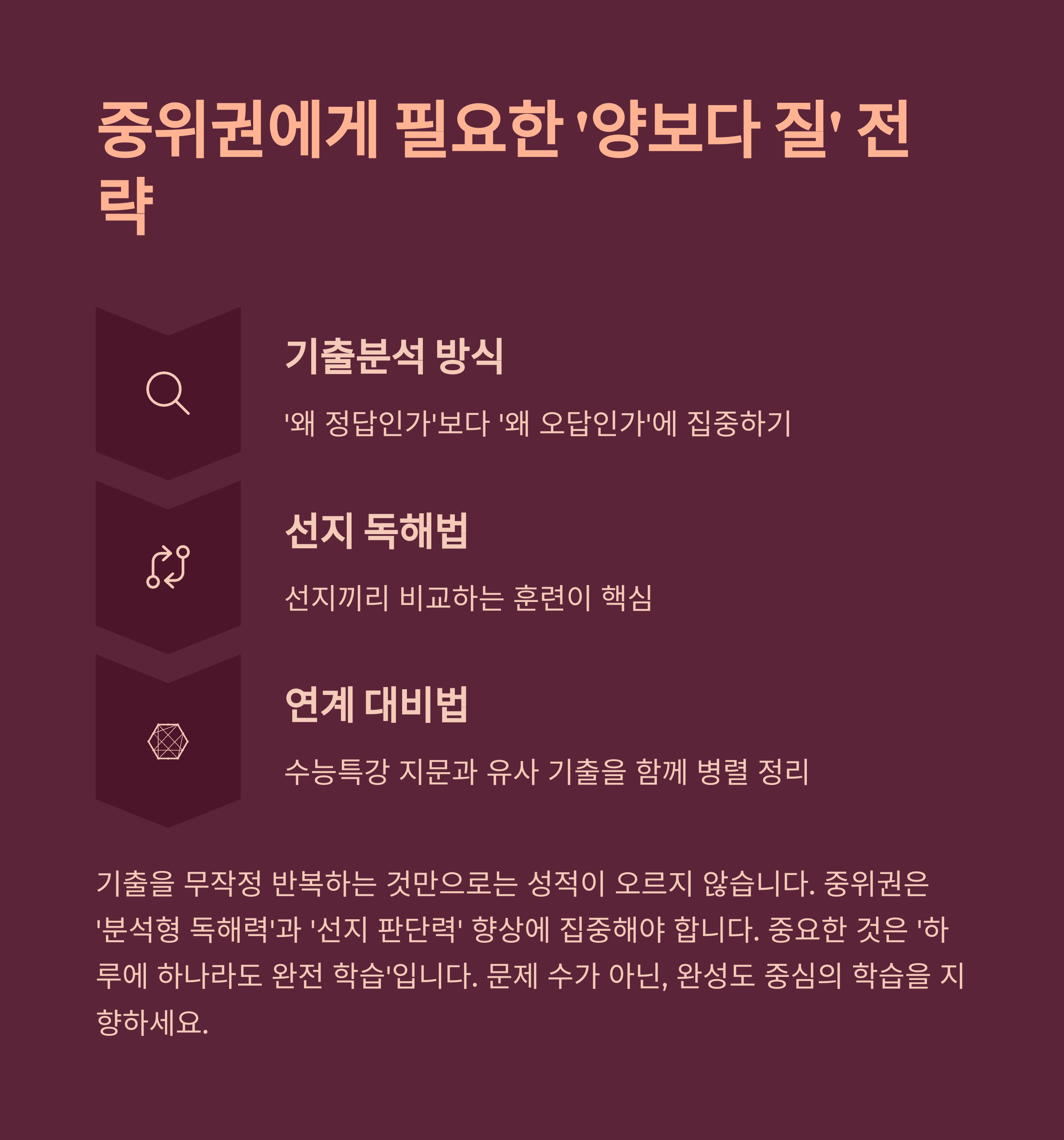 중위권은 ‘분석형 독해력’과 ‘선지 판단력’ 향상에 집중해야 합니다.