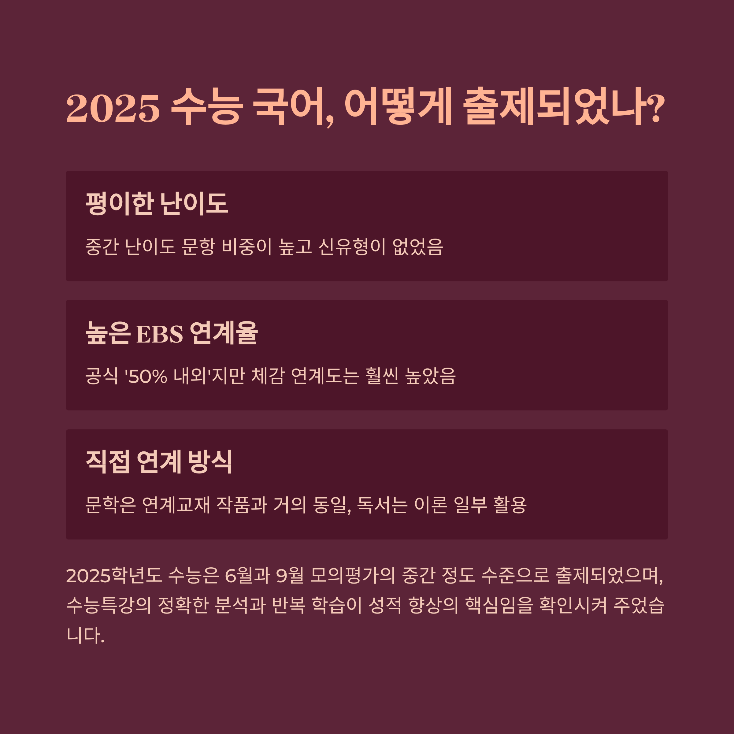 2025학년도 수능은 중간 난이도 문항 비중이 높고 신유형이 없었다는 점에서 전반적으로 평이했습니다.