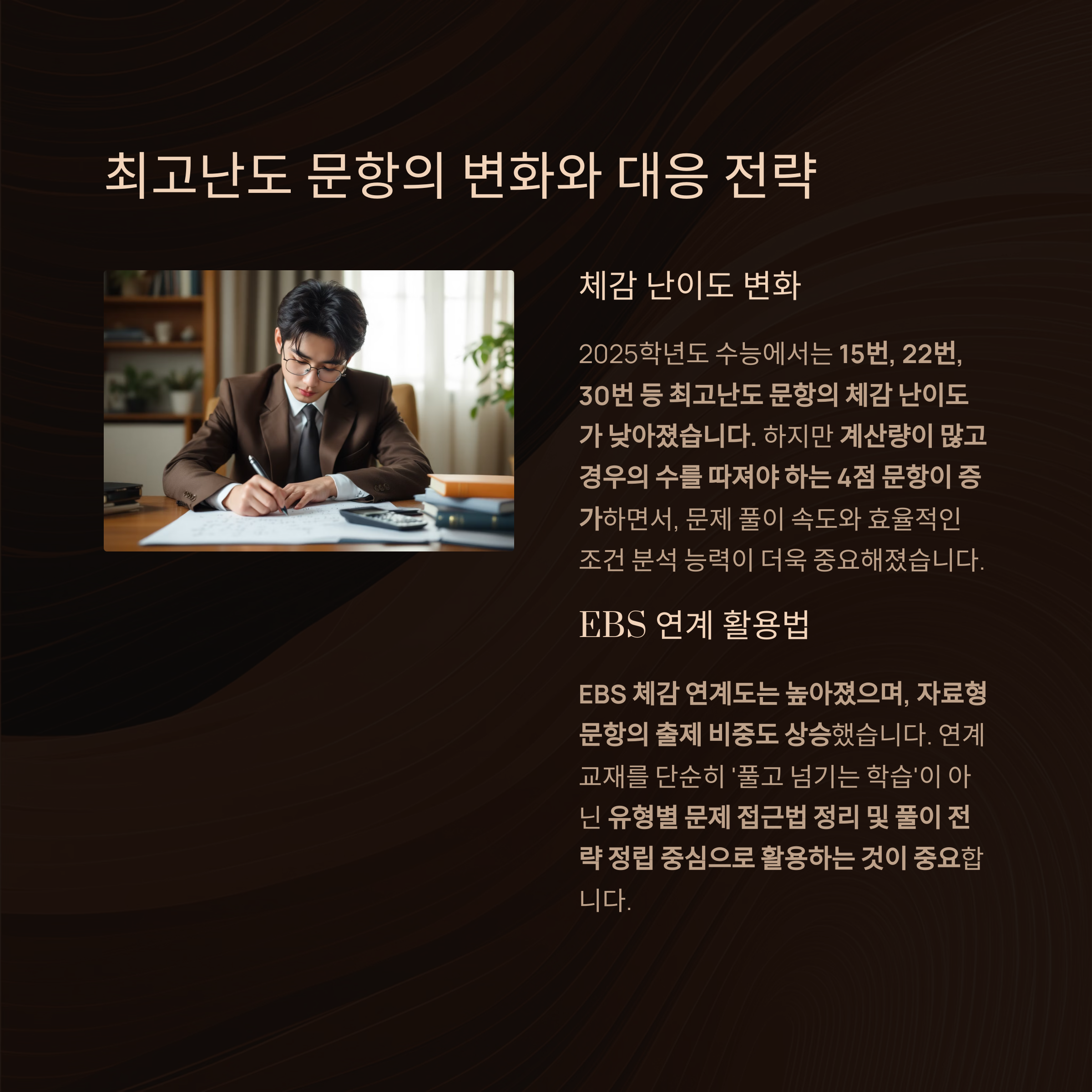 2025학년도 수능에서는 15번, 22번, 30번 등 최고난도 문항의 체감 난이도가 낮아졌습니다.