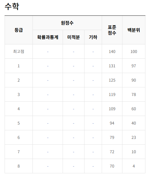 | 수학(기하) | 140 | 88~90점 | 131점 | 미적분과 유사 난이도 |
