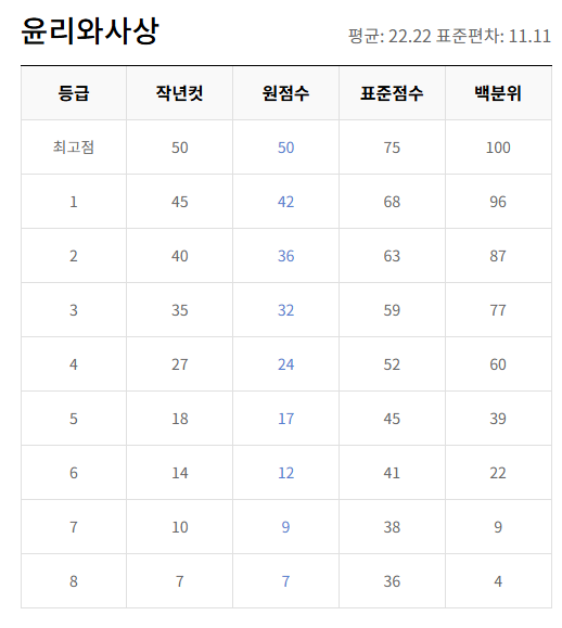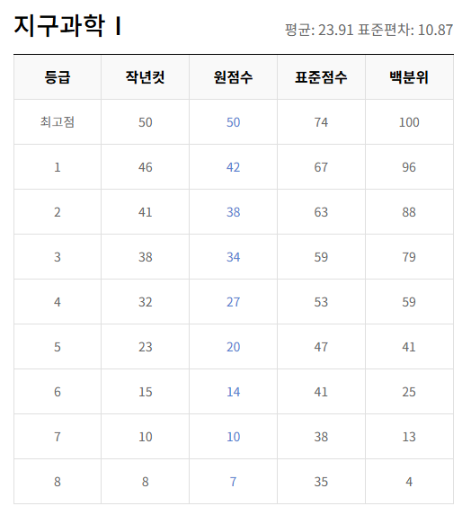 | 과목 | 원점수 만점 | 1등급 원점수 | 1등급 표준점수 | 비고 |